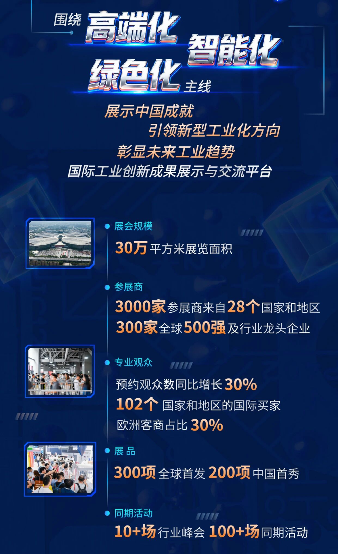 2025中国国际工业博览会(简称“中国工博会”)是中国工业领域最具影响力的国家级工业展会之一,自1999年创办以来,每年秋季在上海举办,已成功举办二十余届。本届工博会于2025年9月23日至27日在国家会展中心(上海)举行,展览面积达30万平方米,吸引了来自全球28个国家和地区的3000多家参展商,其中包括300家全球500强及行业龙头企业。