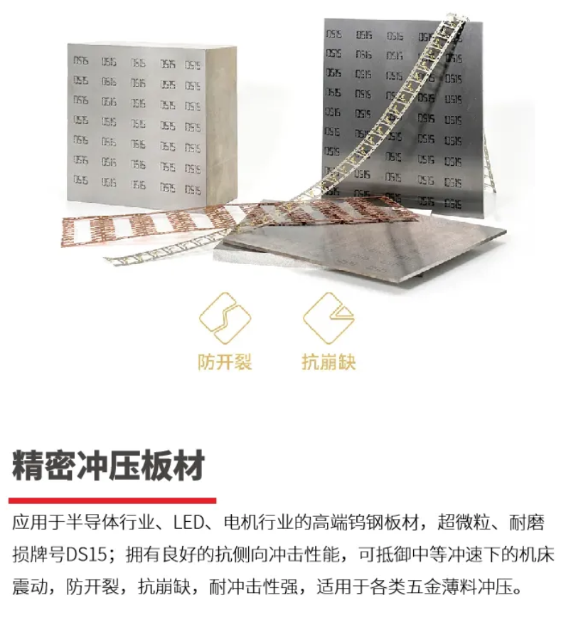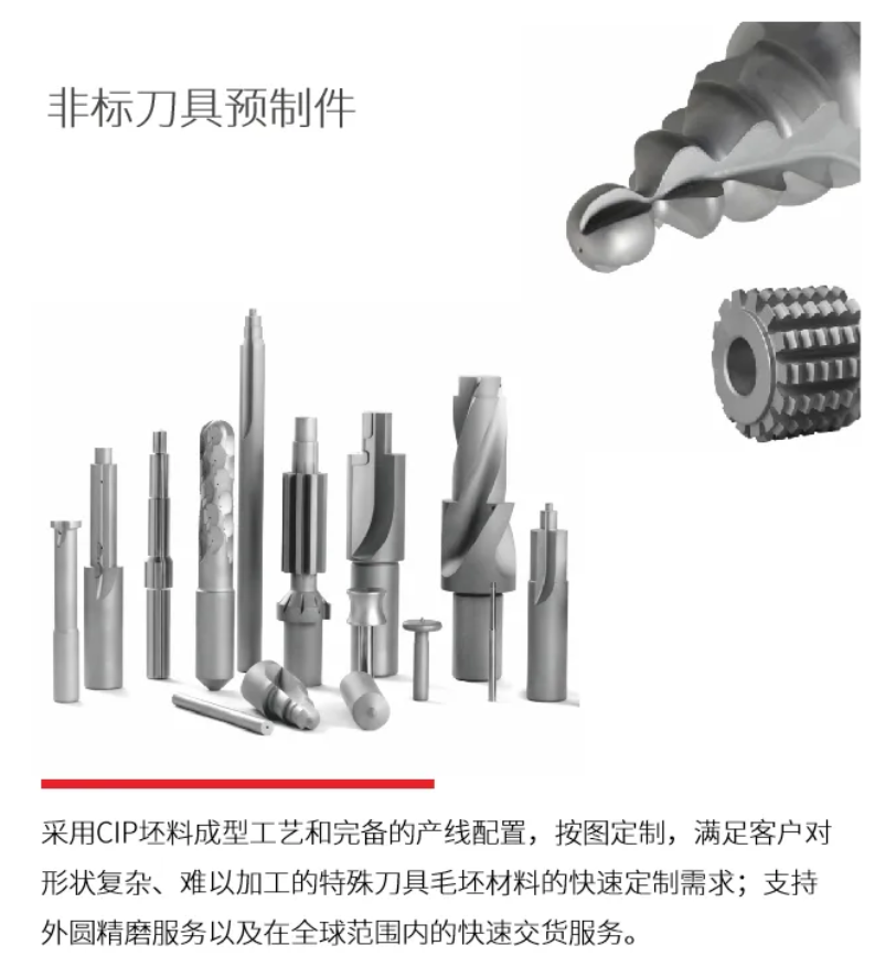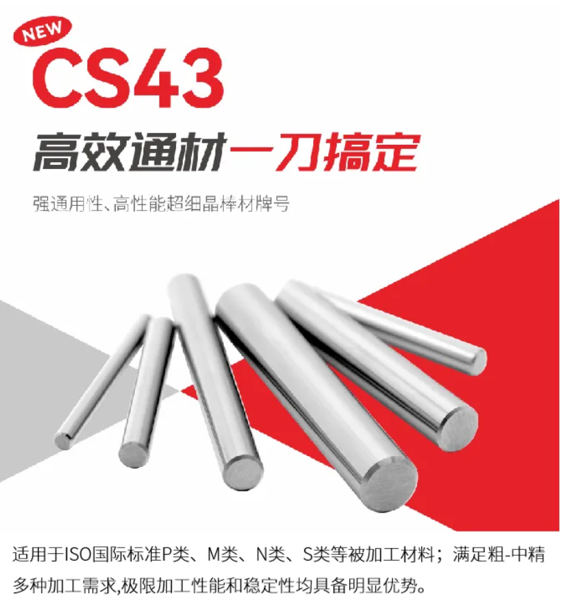 此外,我们也精心筹备了高端硬质合金棒材、模具材料等全系列产品,以满足不同行业的需求。含括:高效通用加工CS43牌号,高硬材料加工SH904牌号,非标刀具预制件;适用于高性能金属加工领域PCD复合片C10F牌号;IC引线框架、裁切模专用DS10,DS15牌号以及金属陶瓷锯齿等。