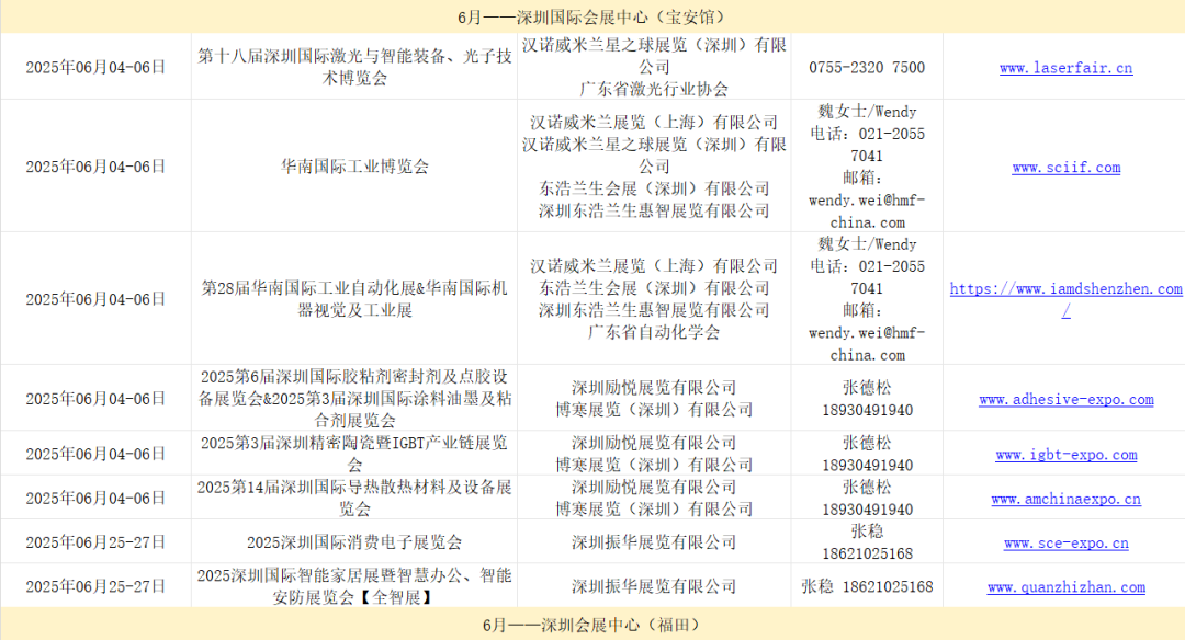点击上方蓝字,关注我们,对话框输入“深圳展会排期”即可免费获取Excel表格,包含联系方式,官网链接