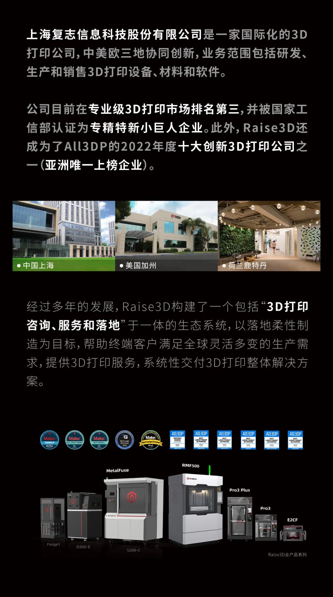 本次展会,Raise3D 将展示面向制造端与工业应用的全流程增材制造解决方案,以助力大湾区企业实现产品快速开发、成本优化与制造升级。Raise3D 诚邀您莅临9号馆9H41展位,与 Raise3D 团队面对面交流,探索工业3D打印的无限可能。