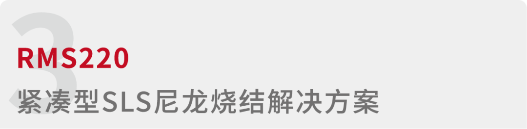 全新 RMS220 以紧凑设计实现高效、精准的尼龙SLS打印,专为快速迭代与小批量生产打造。其先进的激光扫描与温控系统保证高尺寸精度,并支持多材料快速切换,满足不同零件的力学与功能需求。
