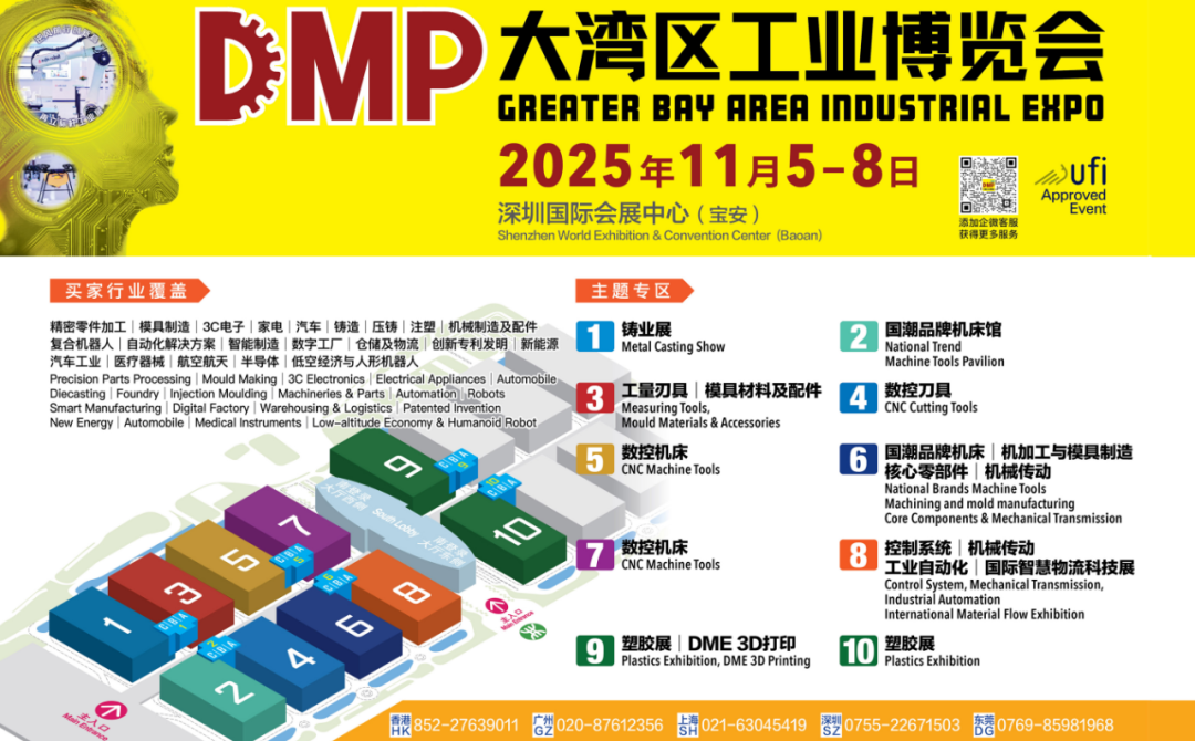 2025年DMP大湾区工博会,将汇聚更丰富的行业解决方案,构建开放共赢的工业生态,整场展会规划了10大展馆,主要包括金属加工与塑料加工2大产业链展区,涵盖数控机床、数控刀具、自动化及机器人、机械传动、压铸及铸造、精密注塑、机加工与模具制造、五金工具等多个领域的新成果、新应用,助力新能源、3C电子、医疗器械、光伏、汽车工业、航空航天等行业企业实现降本增效、高质量发展。