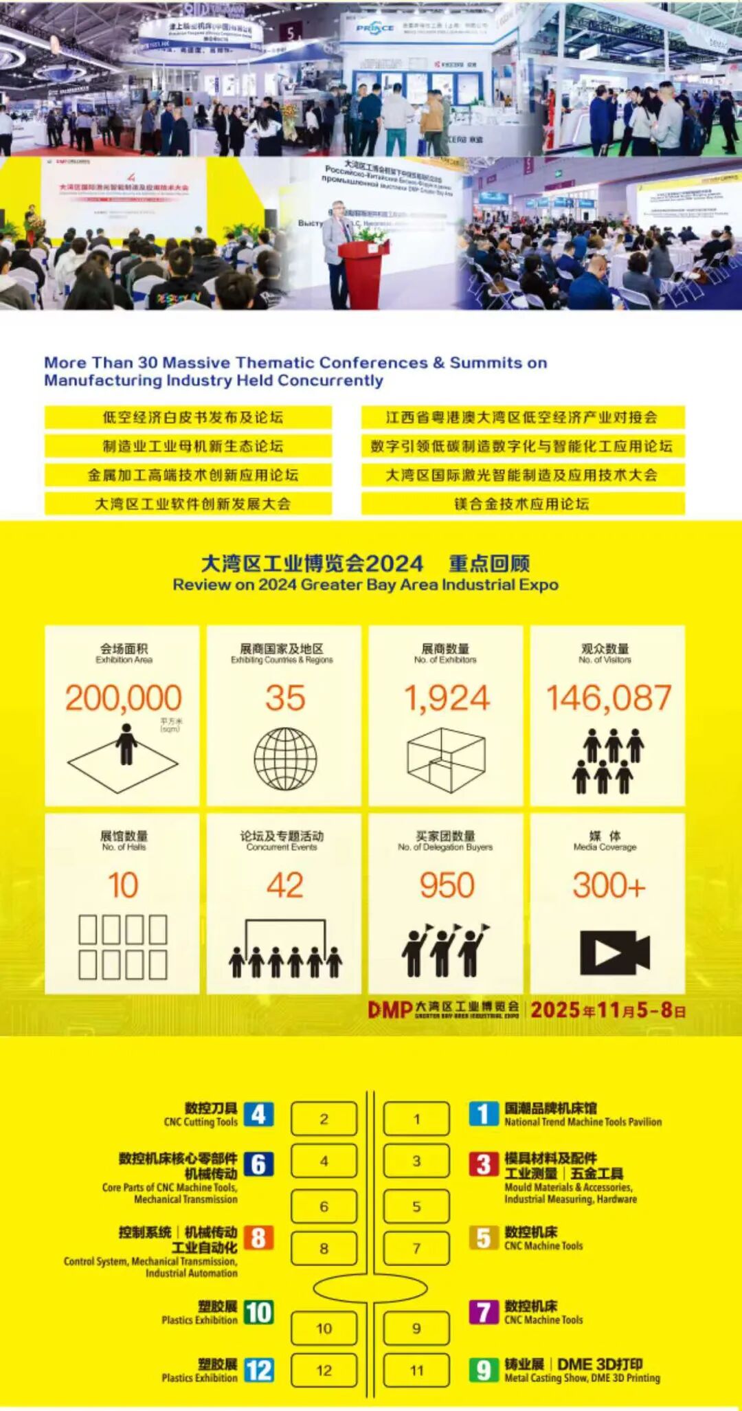DMP大湾区工博会,以技术和创新为主导,是致力于连接科技与工业,赋能行业和全生态的合作平台。展品囊括数控机床、数控刀具、智能制造系统、工业机器人、钣金激光、塑胶及包装、模具制造、工业互联网、工业测量、3D打印、精密零件、数字化工厂、人工智能、压铸铸造、五金工具、金属材料等各个领域,涵盖原辅材料、关键零部件、先进制造装备、整体解决方案、个性化定制等智造产业链条全球创新技术、产品,以规模之大、品类之全、观众之多,深得业界信任,成为粤港澳大湾区先进制造业技术创新的风向标。
