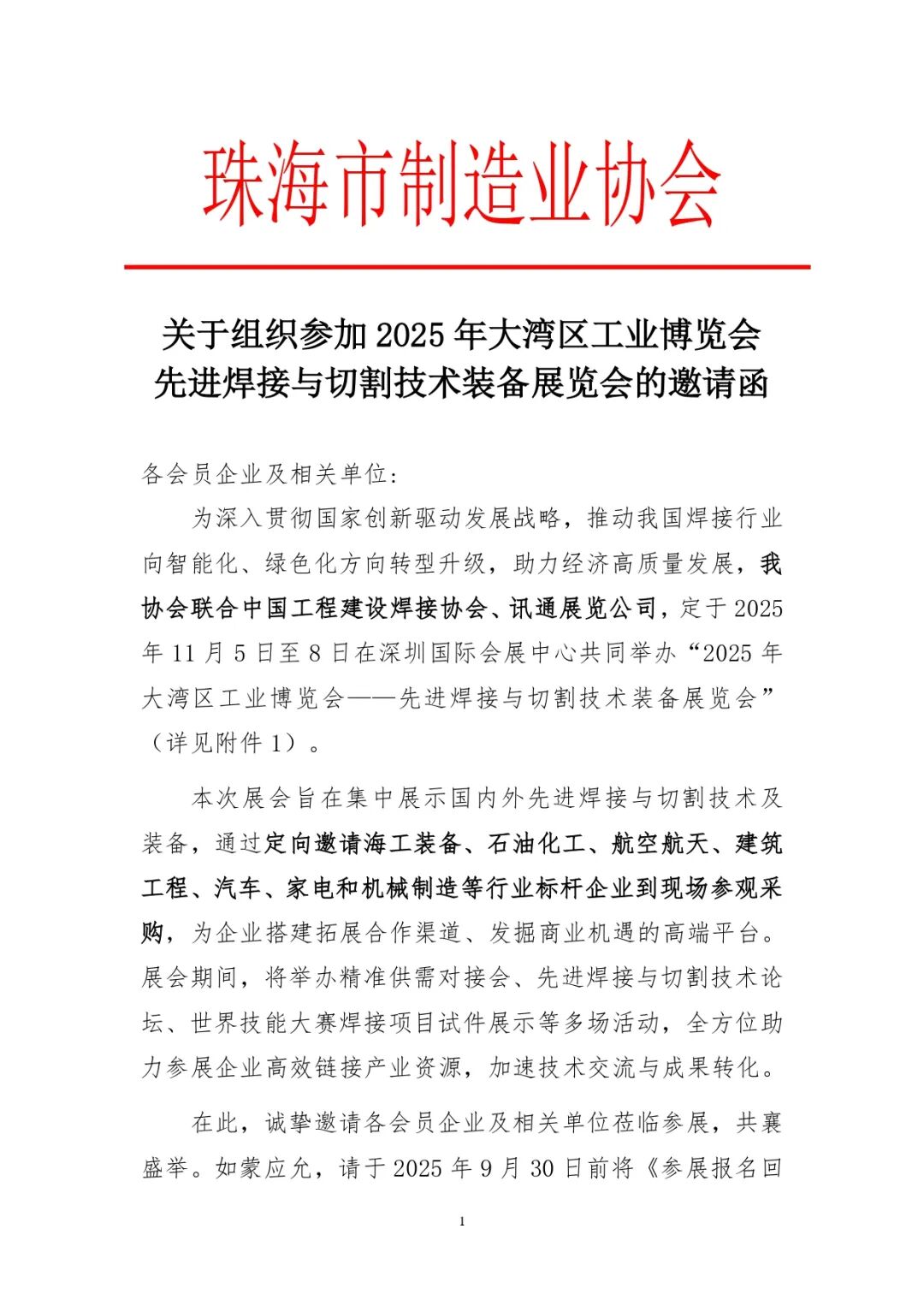为推动我国焊接行业向智能化、绿色化方向转型升级,助力经济高质量发展,我协会联合中国工程建设焊接协会、讯通展览公司,定于2025年11月5日至8日在深圳国际会展中心共同举办“2025年大湾区工业博览会——先进焊接与切割技术装备展览会” ,现诚挚邀请各单位参加,共探行业发展新路径,共筑高端制造新生态。