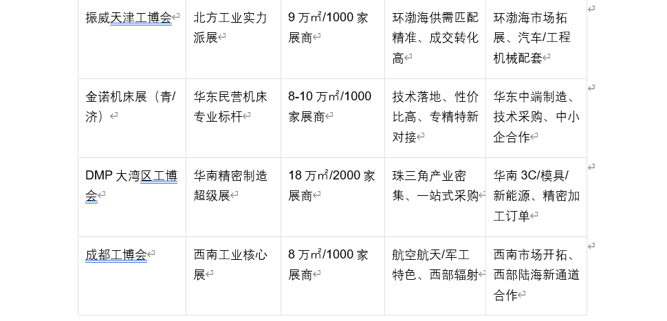 如果企业具备全球布局能力,追求技术高度与国际品牌影响力,北京CIMT、上海CIIF、上海CCMT是第一选择;如果聚焦区域市场开拓,追求实际成交与渠道拓展,振威天津工博会、金诺机床展、DMP大湾区工博会、成都工博会等区域龙头展更具性价比;如果瞄准西北、东北等特色产业带,西安西部制博会、沈阳智博会等区域特色展能提供精准的本地化资源对接;而中小制造企业若追求“参展即获客”,华墨华机展等市场化专业展则是最优解。