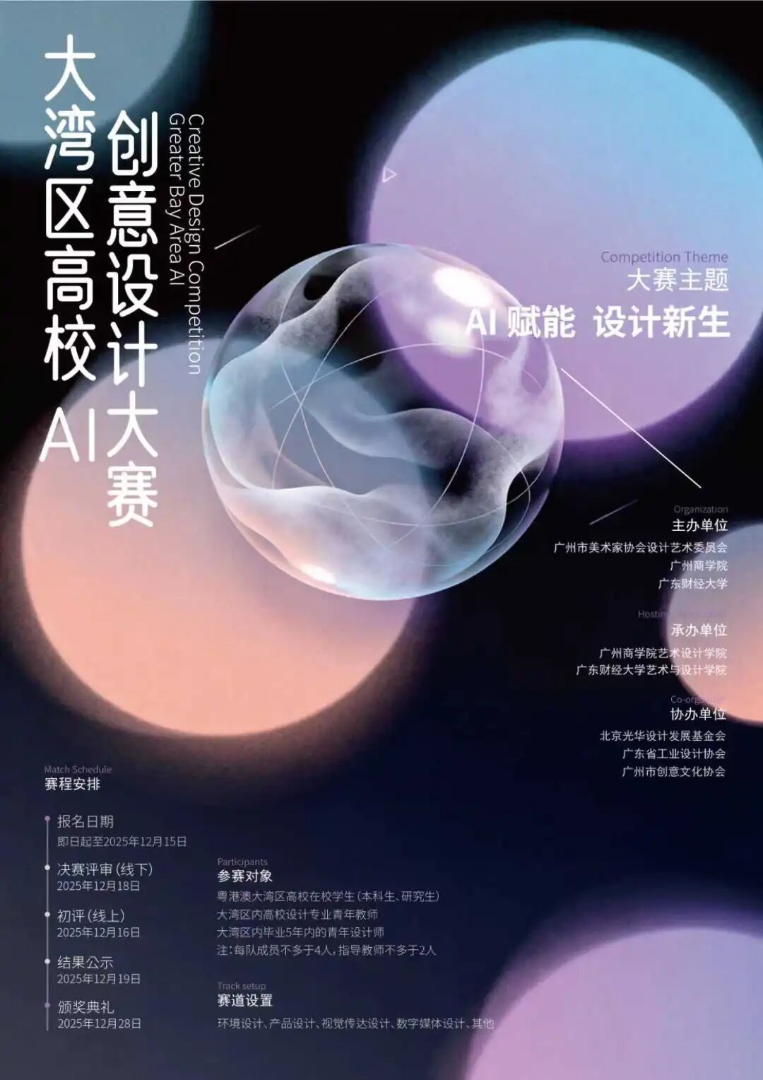 2025年大湾区AI创意设计大赛由广州市美术家协会设计艺术委员会、广州商学院、广东财经大学主办,广州商学院艺术设计学院、广东财经大学艺术与设计学院承办,北京光华设计发展基金会、广东省工业设计协会、广州市创意文化协会联合协办。大赛立足粤港澳大湾区发展战略,汇聚湾区设计智慧,聚焦人工智能技术在设计领域中的创新应用,致力于搭建产学研用深度融合的交流平台,推动设计成果转化,服务大湾区经济高质量发展。