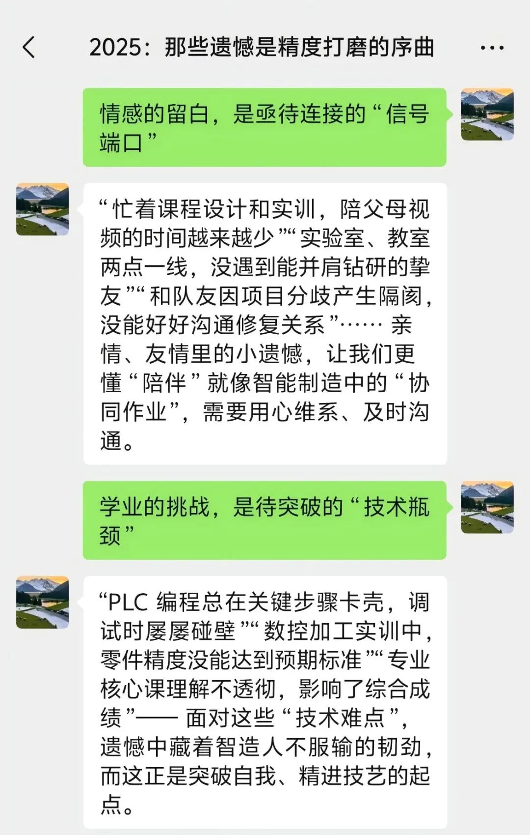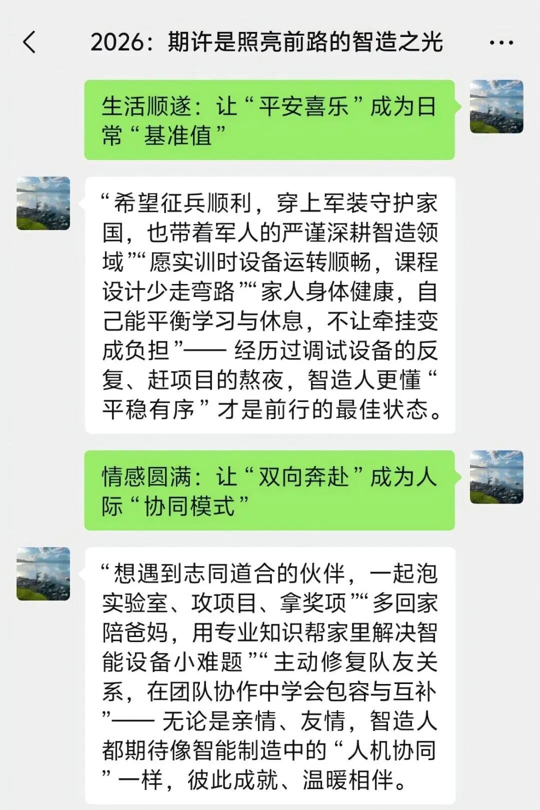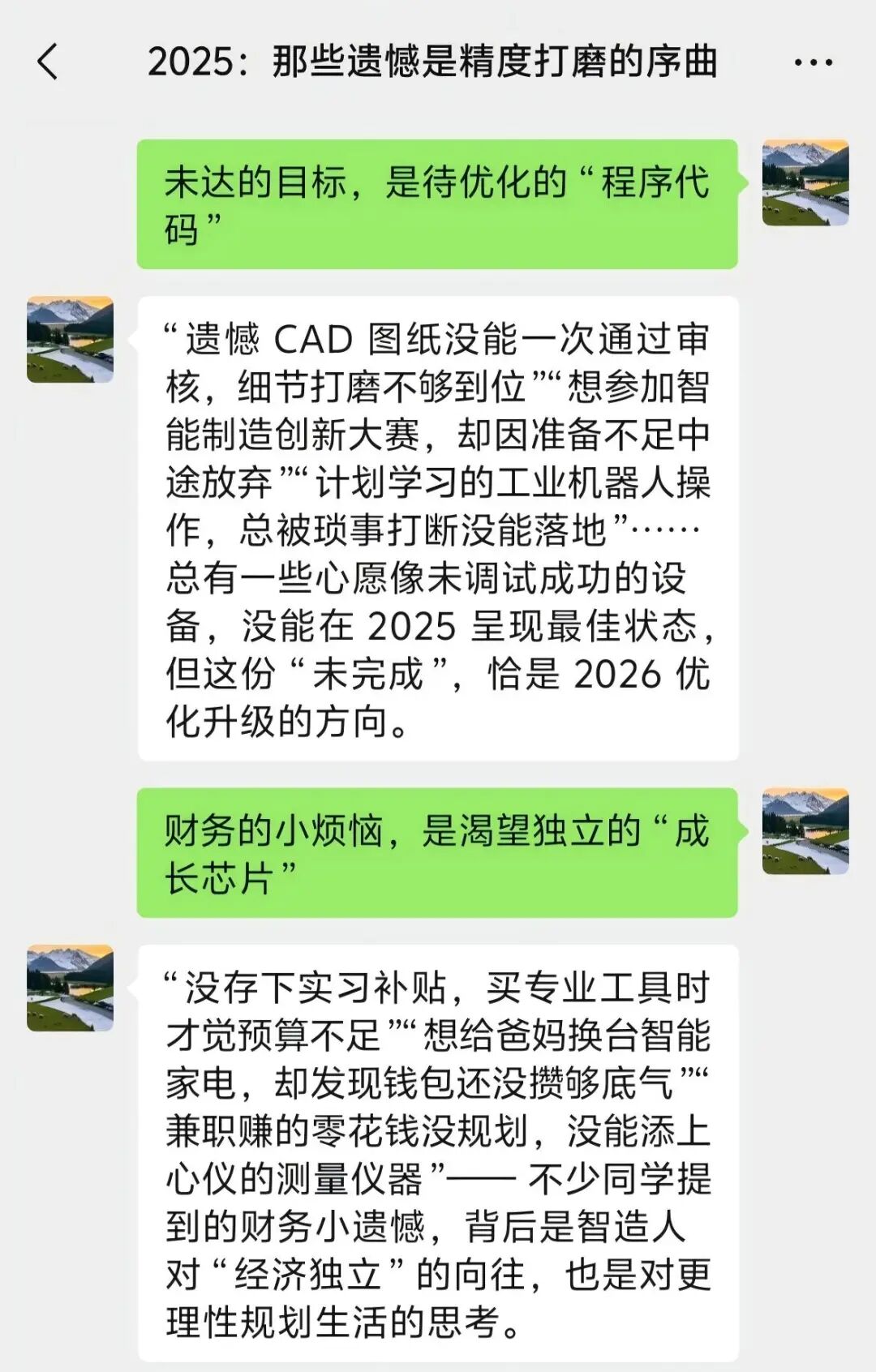 学院发起的 “2025 遗憾与 2026 期许” 征集活动,收到了无数真挚留言。每一条心声,都像数控加工时的精准刻度,标注着我们对生活的认真;每一段倾诉,都似 3D 打印的细腻层叠,藏着对未来的热忱。今天,我们把这些智能人的心里话整理成文,一同细数过往、奔赴新程。