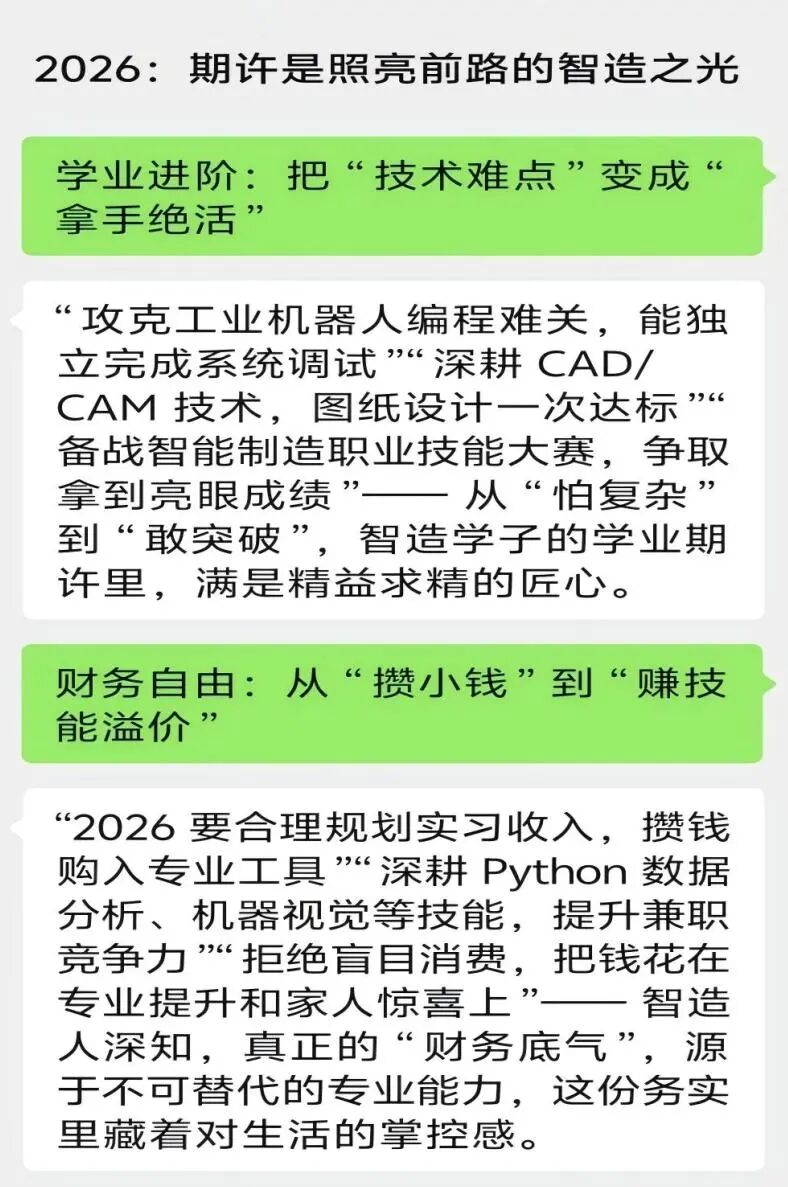 新的一年,智能制造学院会继续做你最坚实的 “后盾平台”—— 陪你攻克技术难关,陪你对接实习资源,陪你搭建交流桥梁,陪你把 2026 的每一份期许,都打磨成触手可及的现实。