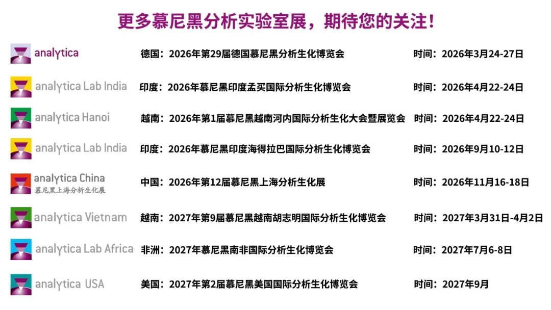 实验室世界正在飞速发展,而在2027年美国国际分析生化实验室展博览会analytica USA上,您将处于这一进步的中心。实验室技术、分析和生物技术贸易展览会为您提供完整的市场概览:与市场领导者和专家会面,了解全球首发产品,找到满足您需求的最佳解决方案。