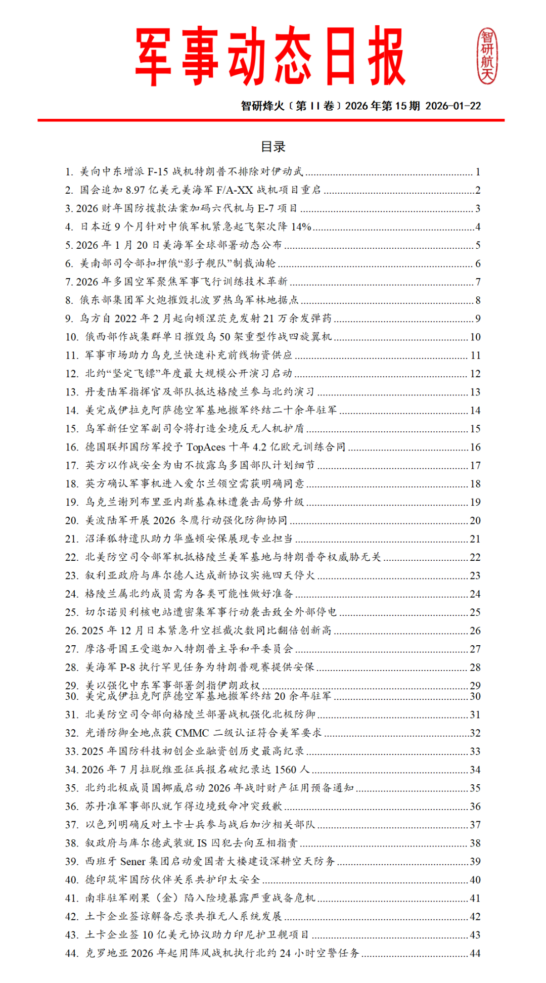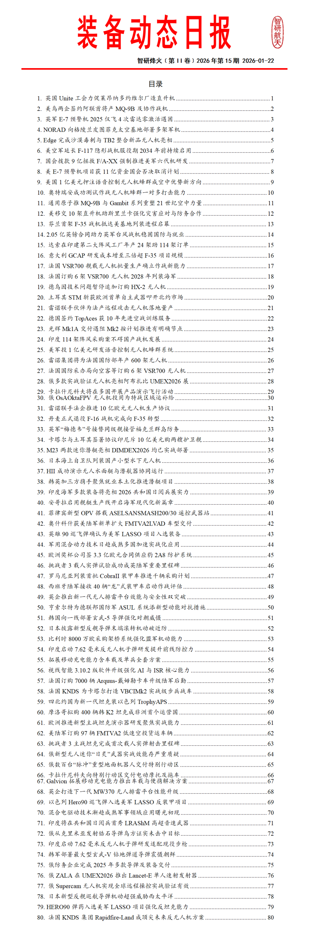《全球防务动态》系列专刊国内独家每日发布涵盖航天领域、武器装备、军事热点、人工智能、先进制造等领域的全球动态信息。提供航天动态专报装备动态专报军事动态专报智造动态专报以及航天防务新闻日报等特色产品模块工作日每日推送,形成结构化、可编辑的文档,供订阅用户在小程序智研烽火信息商城下载。每日及时的动态信息能够有支持各单位进行报送、军情研究与安全形势分析的需求。