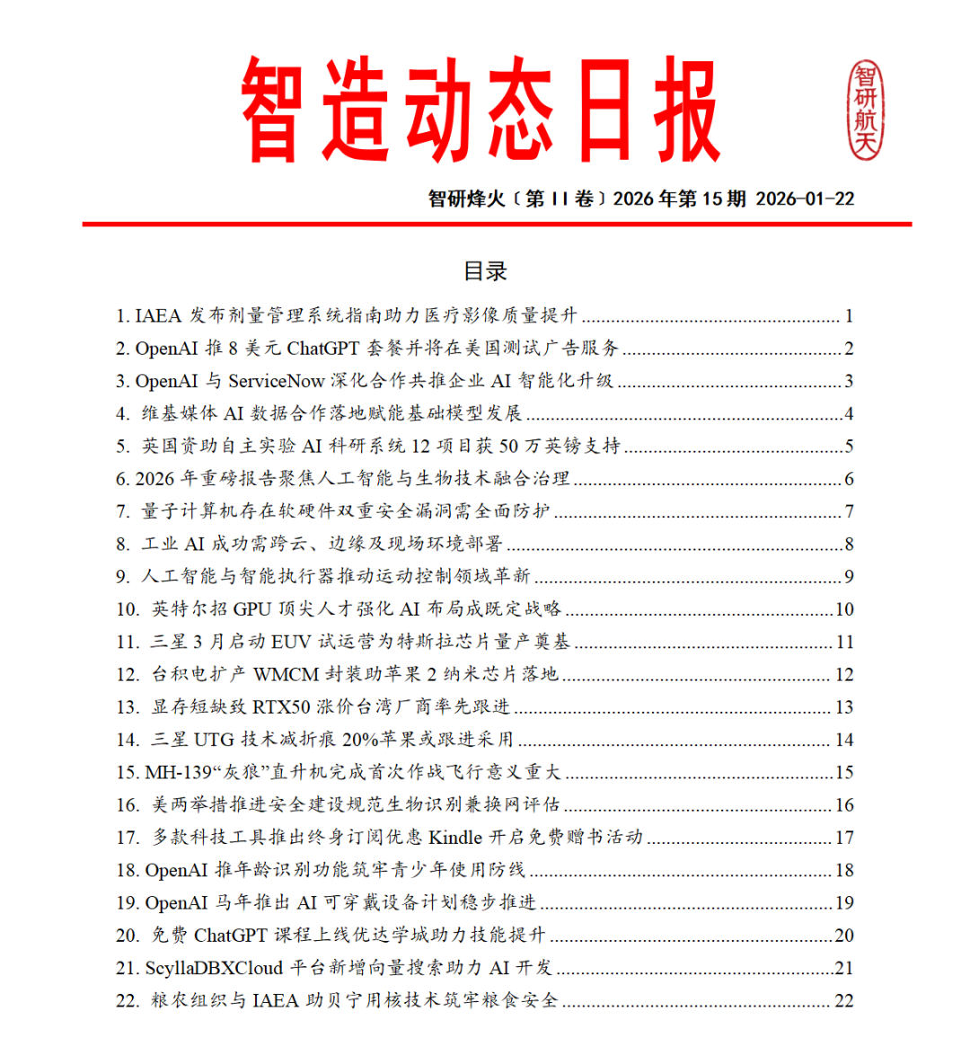 聚焦全球智能制造领域的权威情报产品,每日精选航空技术与应用人工智能、工业机器人、增材制造、芯片工艺等核心技术突破与产业动态,以结构化、可编辑的文档形式呈现。内容涵盖技术解析、企业战略及政策影响,依托资深专家团队及强大的开源情报处理能力,助力企业快速捕捉技术趋势与市场机遇,把握智造脉搏,引领产业升级。