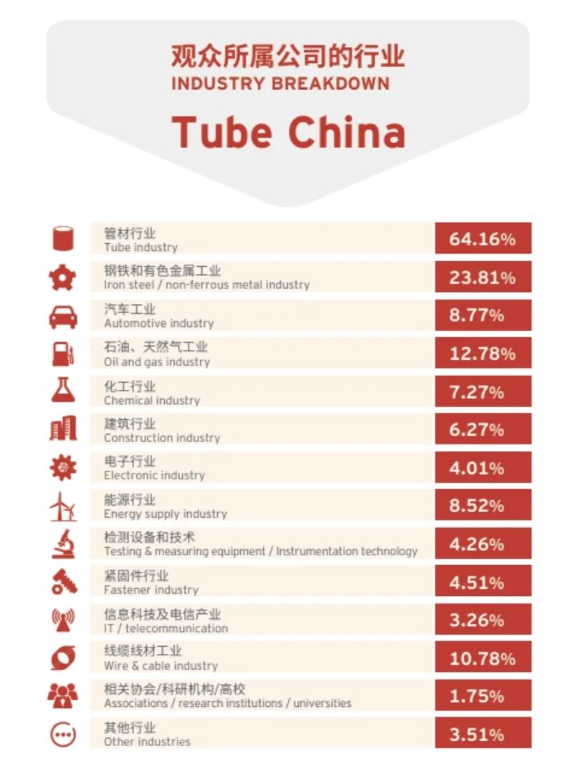 历经20年的积淀,Tube China不仅成为了亚洲领先的管材、管道行业展览会,也是行业的先驱者。主办方杜塞尔多夫展览(上海)有限公司和中国国际贸易促进委员会冶金行业分会将发挥各自优势,推进管材制造技术创新、节能环保、绿色化和智能化转型,提供全新升级的贸易交流平台,聚焦行业热点,以专业的视角呈现行业最新的产品、可交易技术及解决方案。