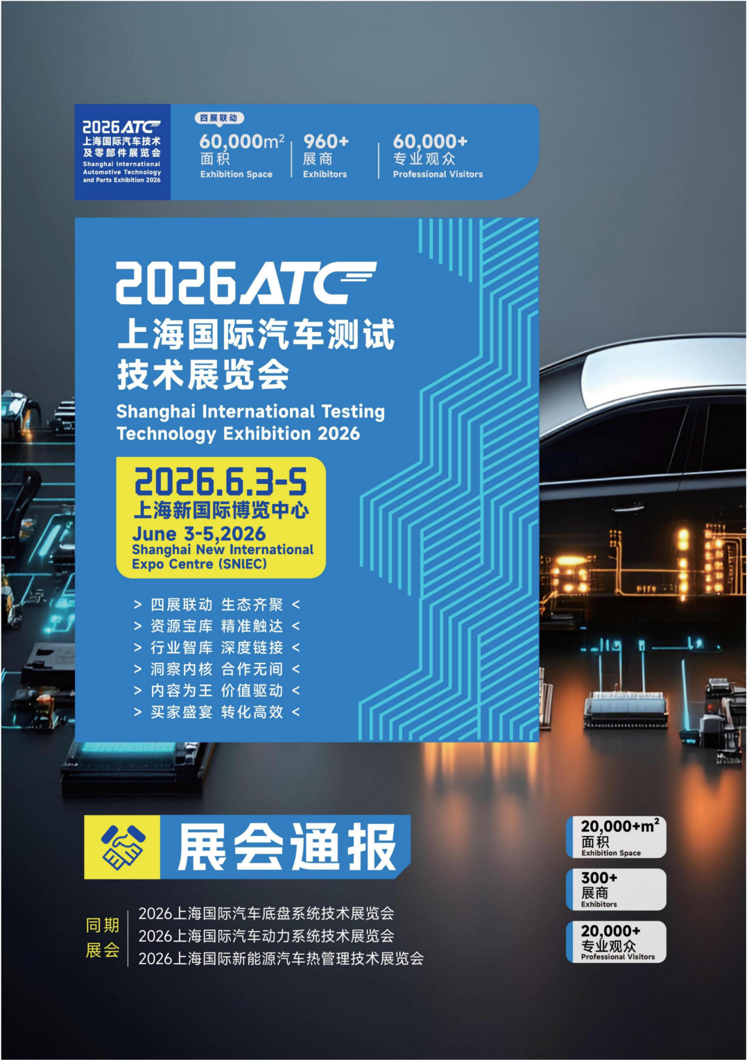 2026 ATC 上海国际汽车测试技术展览会,作为亚洲极具影响力的汽车测试领域专业展会,将于 6 月 3—5 日在上海新国际博览中心 举办。展会聚焦汽车测试全产业链,汇聚全球前沿技术与优质资源,构建集技术交流、产业对接、趋势洞察于一体的专业平台,为行业高质量发展提供高效支撑。