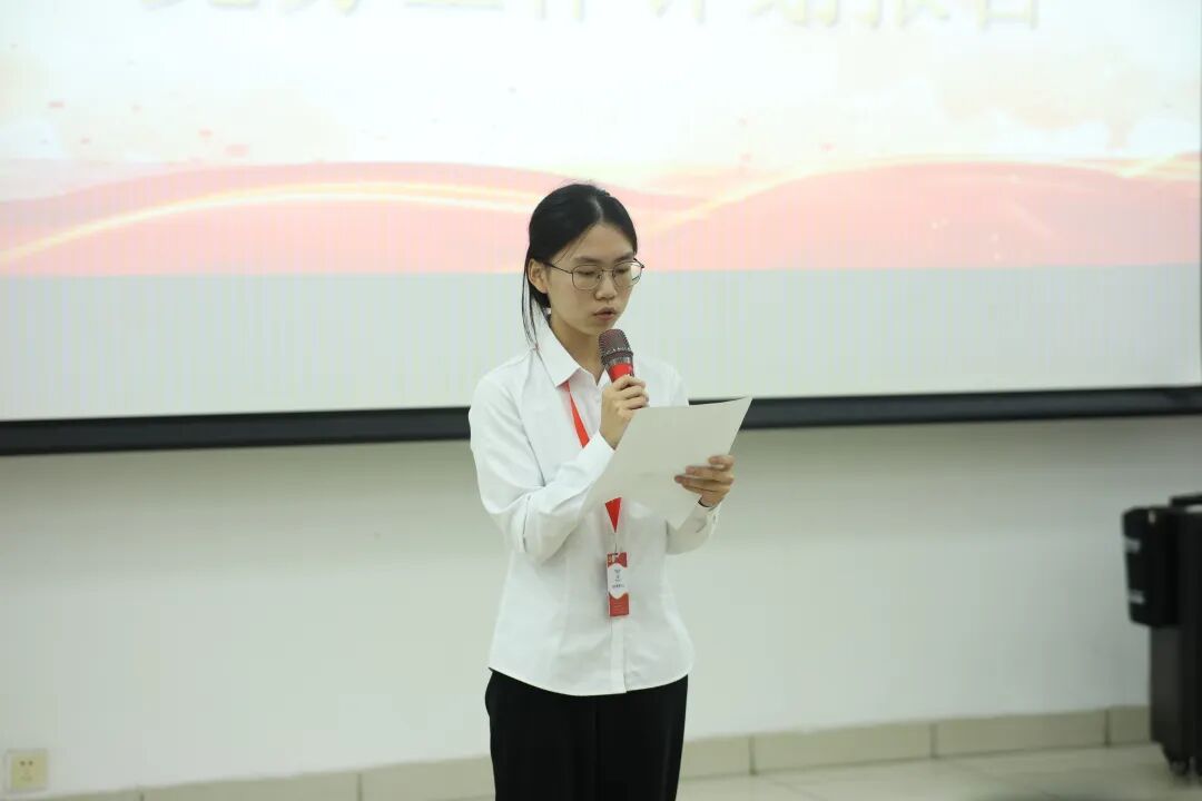 紧接着,新一届党务管理中心主任周丽纯同学为大会作2025-2026学年度工作计划报告。首先,她表示将会郑重接过接力棒,并对未来工作充满信心。她回顾了上一学年党务管理中心在思想引领、党员发展及组织协同等方面取得的扎实成效,为新学年工作奠定了坚实基础。展望未来,新的学年党务管理中心将以巩固基础、开拓创新为总体思路,重点从两方面着力:一是聚焦主责主业,严把党员入口关,通过推动审批工作标准化与加强过程培养联系,切实提升党员发展质量;二是加强内外联动,通过深化内部建设传承和拓展外部协作,提升资源整合力。她表示,新一届骨干将牢记嘱托、担当奋斗,在学院党总支的领导下,持续为党建工作贡献青春力量。