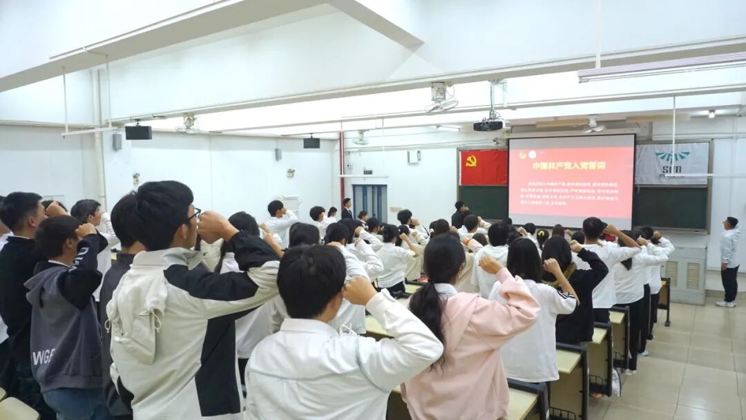 在本次换届大会的尾声,学生党支部书记冯少鸿老师带领今晚到场的全体师生重温入党誓词。