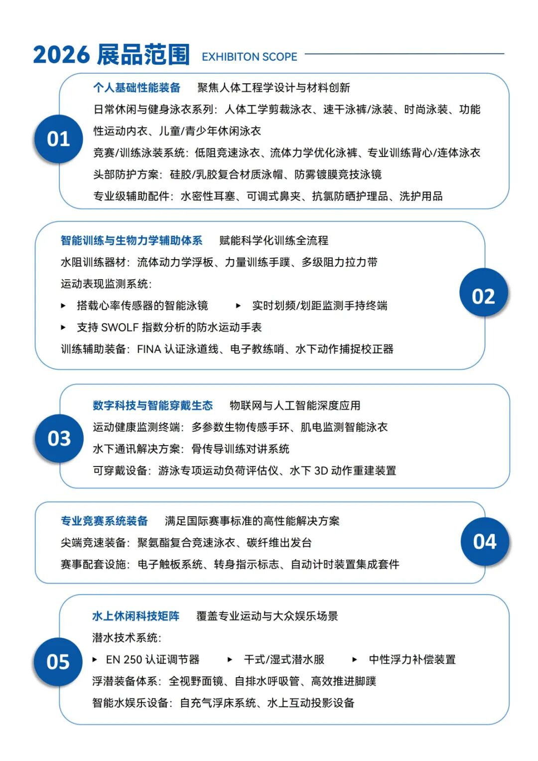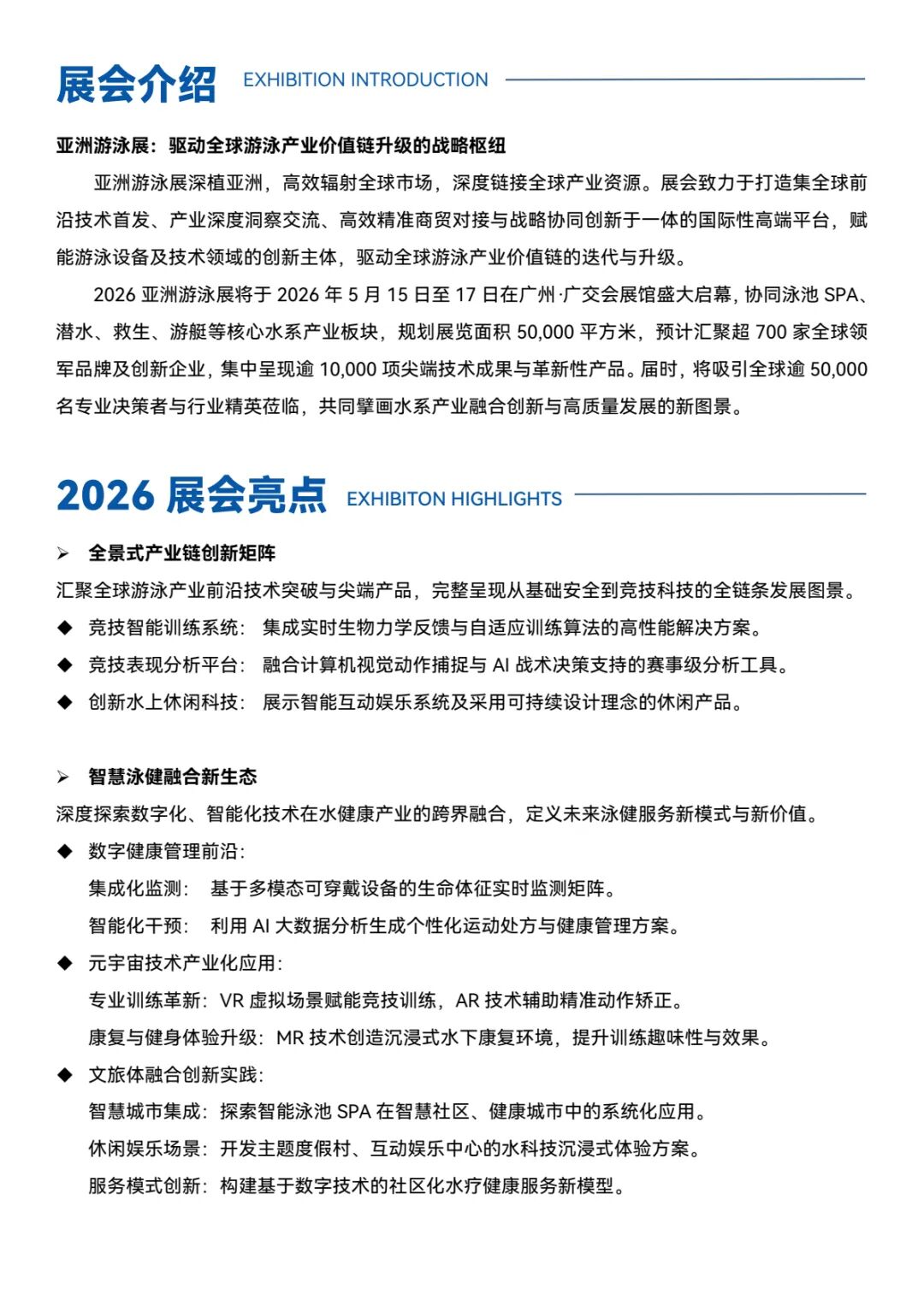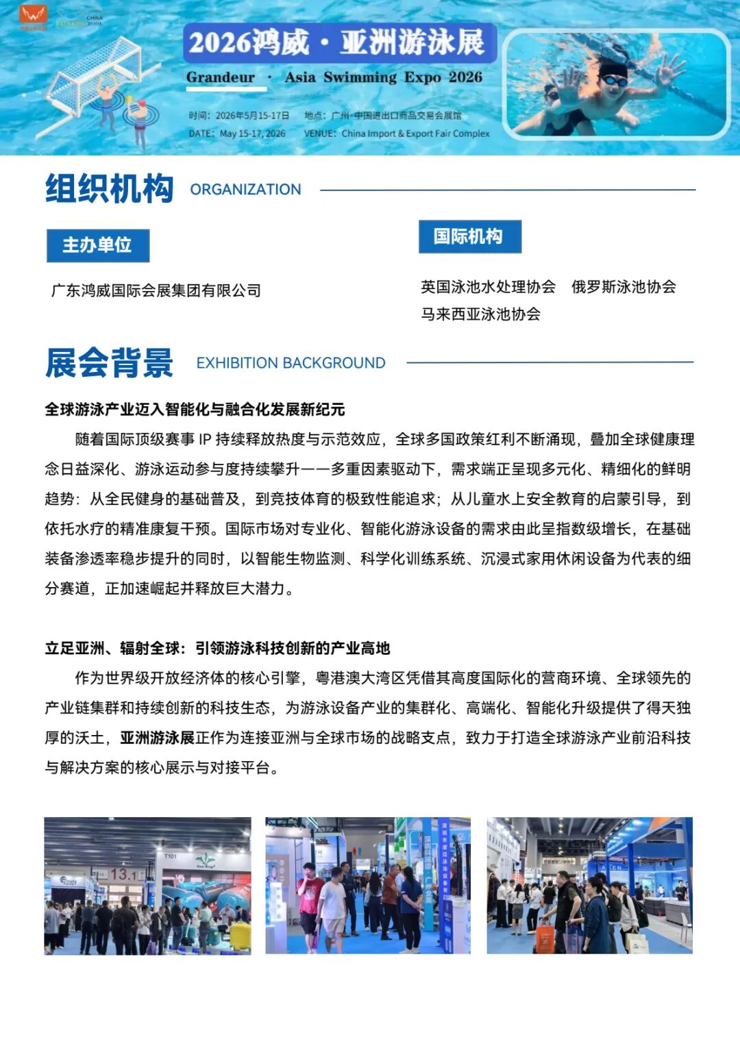 亚洲游泳展:驱动全球游泳产业价值链升级的战略枢纽亚洲游泳展深植亚洲,高效辐射全球市场,深度链接全球产业资源。展会致力于打造集全球前沿技术首发、产业深度洞察交流、高效精准商贸对接与战略协同创新于一体的国际性高端平台,赋能游泳设备及技术领域的创新主体,驱动全球游泳产业价值链的迭代与升级。2026亚洲游泳展将于2026年5月15日至17日在广州·广交会展馆盛大启幕,协同泳池SPA、潜水、救生、游艇等核心水系产业板块,规划展览面积50,000平方米,预计汇聚超700家全球领军品牌及创新企业,集中呈现逾10,000项尖端技术成果与革新性产品。届时,将吸引全球逾50,000名专业决策者与行业精英莅临,共同擘画水系产业融合创新与高质量发展的新图景。