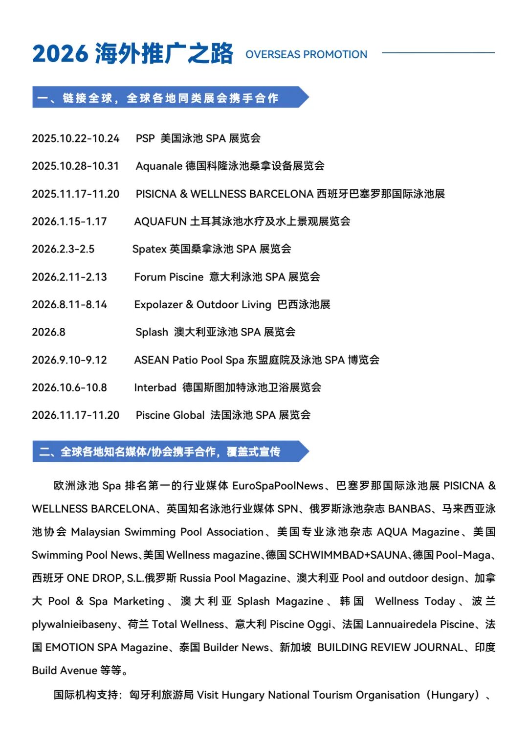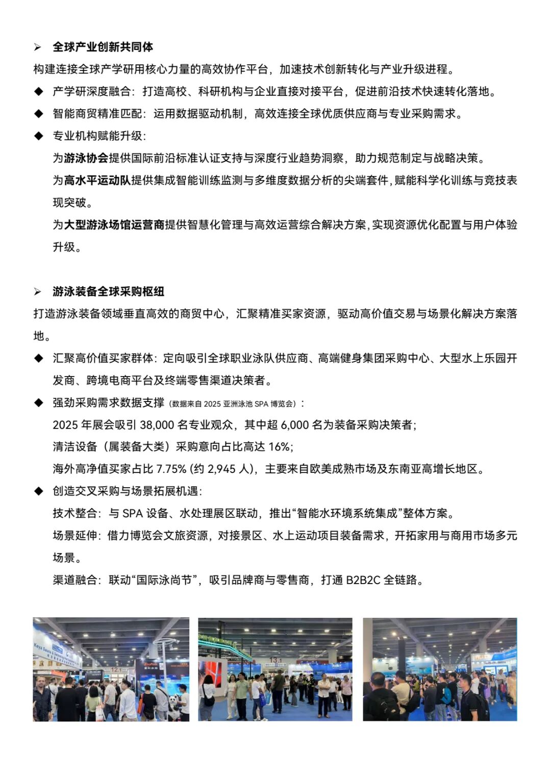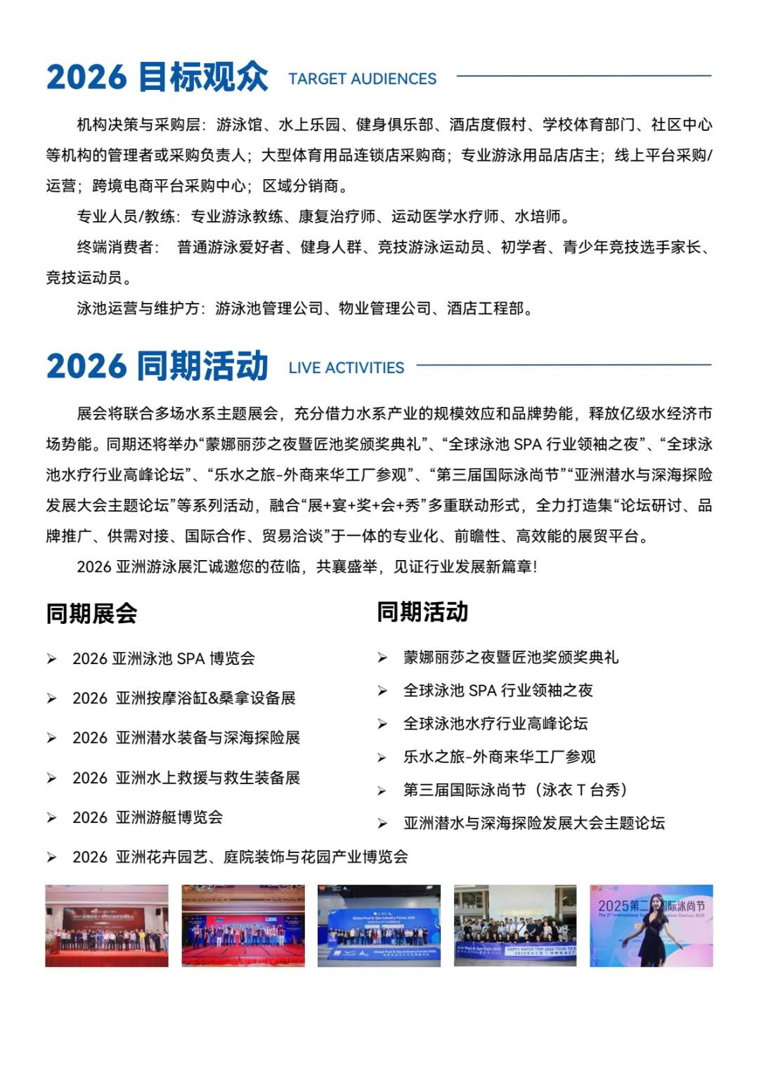亚洲游泳展:驱动全球游泳产业价值链升级的战略枢纽亚洲游泳展深植亚洲,高效辐射全球市场,深度链接全球产业资源。展会致力于打造集全球前沿技术首发、产业深度洞察交流、高效精准商贸对接与战略协同创新于一体的国际性高端平台,赋能游泳设备及技术领域的创新主体,驱动全球游泳产业价值链的迭代与升级。2026亚洲游泳展将于2026年5月15日至17日在广州·广交会展馆盛大启幕,协同泳池SPA、潜水、救生、游艇等核心水系产业板块,规划展览面积50,000平方米,预计汇聚超700家全球领军品牌及创新企业,集中呈现逾10,000项尖端技术成果与革新性产品。届时,将吸引全球逾50,000名专业决策者与行业精英莅临,共同擘画水系产业融合创新与高质量发展的新图景。