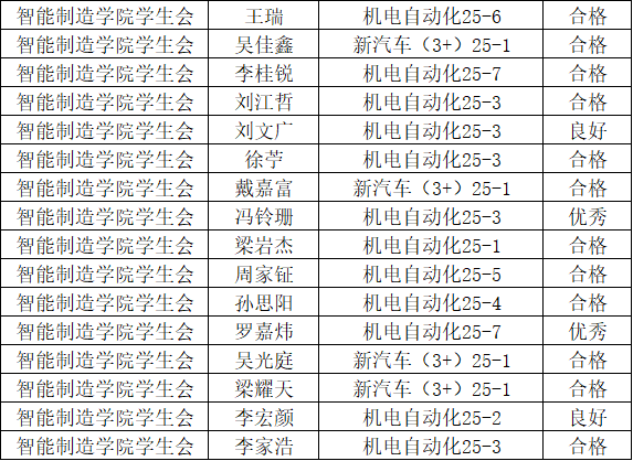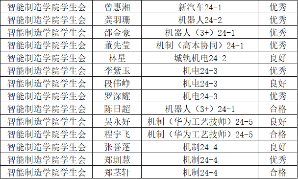 在过去的一学期中,智能制造学院学生会全体成员秉承“智造生活每一天,我们就在你身边”的宗旨,积极投入到各项工作中。为激励先进、提升整体工作效能,学生会于近期开展了2025—2026学年第一学期考核评议。由学生会指导老师、主席团和各部门负责人结合日常工作表现、活动参与贡献等多维度对学生骨干、工作人员进行综合评定,现将考核结果公示如下: