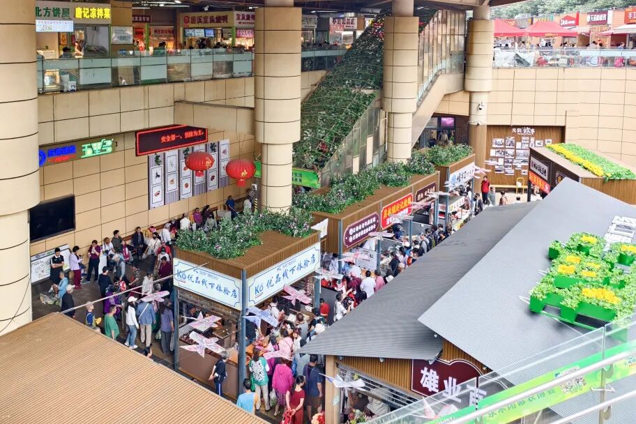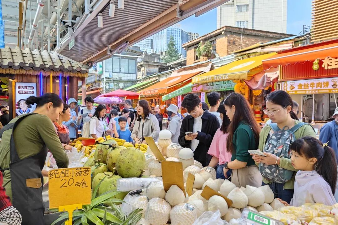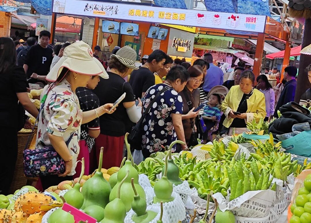 五里多农博广场在暑期升级建成本地首个适老化农贸市场,通风、消防、排污系统同步完成改造,购物体验大幅提升。灰砖墙上的老式招牌、竹编货篮里的鲜果、老茶馆服务站里的八仙桌,复刻出老昆明的市井记忆,让逛菜市成为充满烟火味的温暖日常。整个暑期,五里多农博广场热闹非凡,单日人流量稳定在4至5万人次。