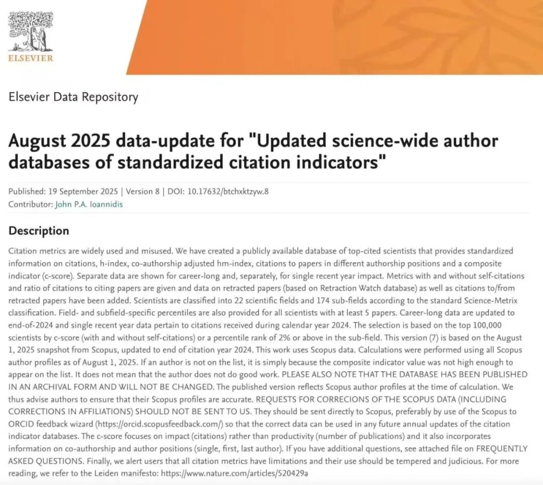 日前,美国斯坦福大学John P. A. Ioannidis 教授团队发布2025年版“全球前2%科学家榜单”(World's Top 2% Scientists),其中包括“学术生涯影响力排行榜”和“年度科学影响力排行榜”两个榜单。