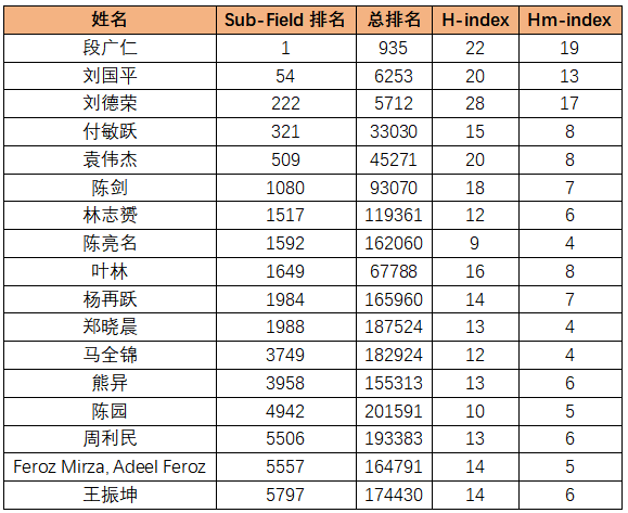 榜单数据来源于全球最大的摘要和引文数据库Scopus数据库,主要从引文数量(citations)、H指数(H-index)、同行合作调整后的HM指数(Co-authorship adjusted HM-index)、不同作者单位论文的引用量(Citations to papers in different authorship positions)和综合指标(Composite indicator)六个指标进行衡量。