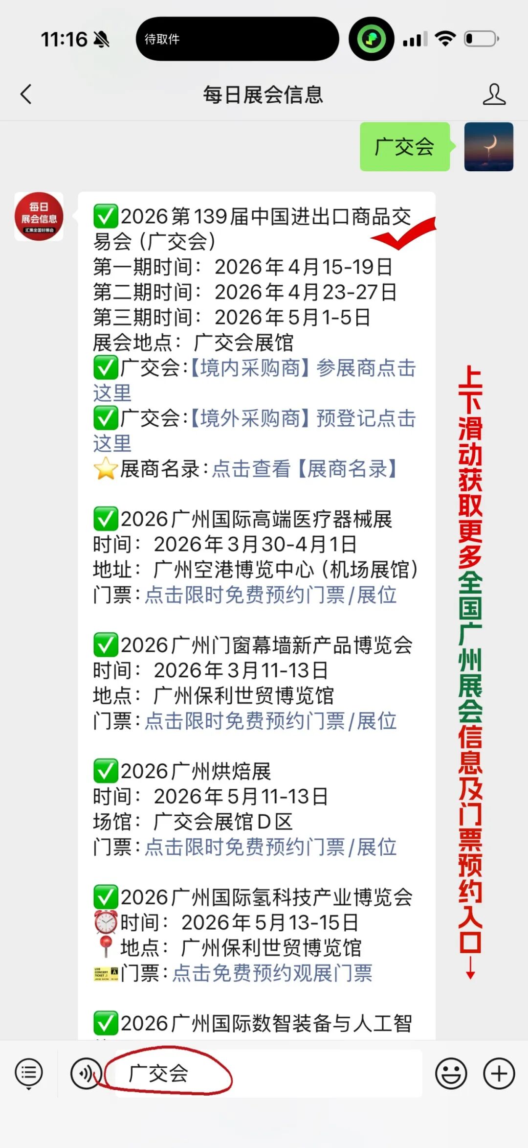 关注【每日展会信息】微信公众号,在聊天对话框内回复【广州】查看广州近期展会信息/门票/展位咨询入口