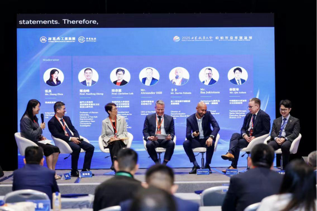 在圆桌论坛环节,厦门大学教授、嘉庚创新实验室主任郑南峰,香港科技大学教授、环境及可持续发展学部首席发展顾问陆恭蕙,全球甲醇协会首席执行官Alexander Döll,马士基集团中国脱碳业务总监Karim Fahssis,Deltamarin销售及营销总监、副总裁Esa Jokioinen,中国船级社新加坡分社技术经理秦傲寒6位嘉宾围绕“智慧清洁燃料 船承绿色未来”展开了深度对话,激荡思想火花,凝聚行业共识。华商能源独立董事张真主持圆桌论坛。