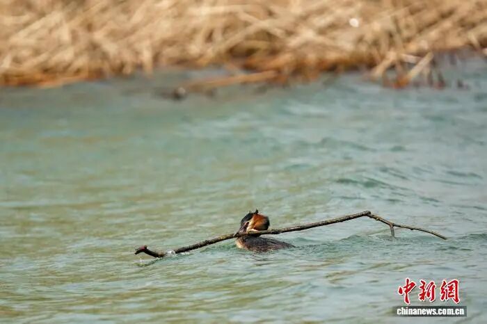 "河南郑州:凤头鸊鷉龙子湖畔筑巢繁殖"
