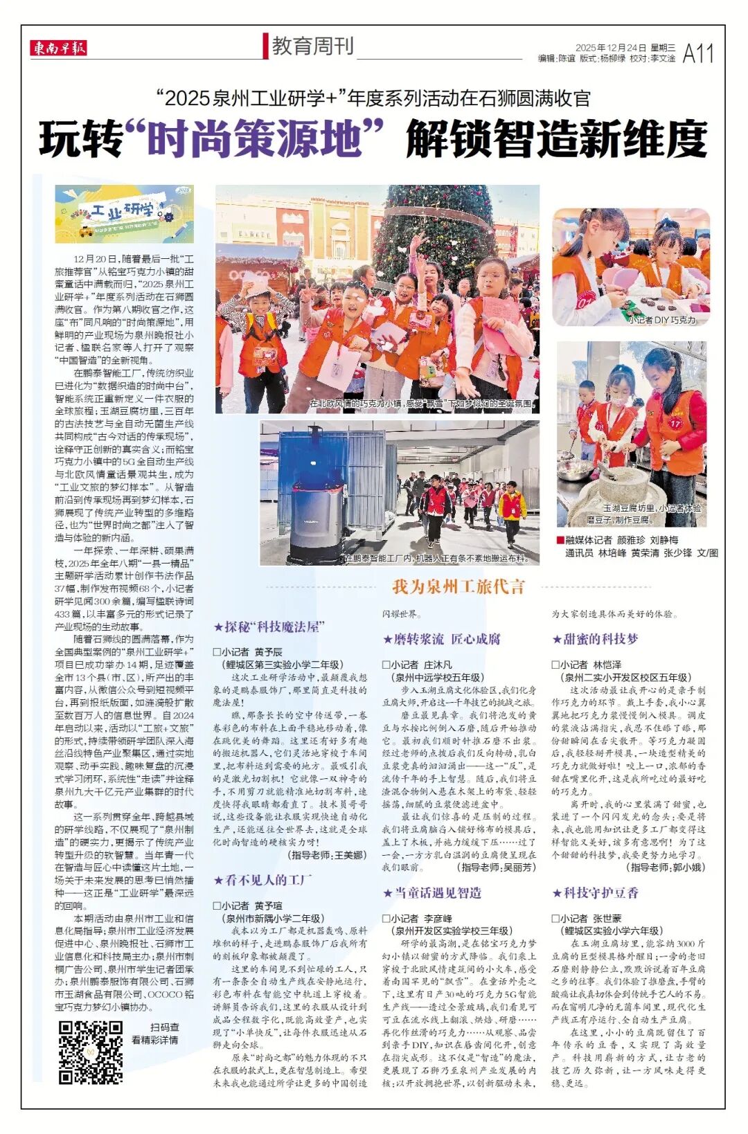 12月20日,随着最后一批“工旅推荐官”从铭宝巧克力小镇的甜蜜童话中满载而归,“2025泉州工业研学+”年度系列活动在石狮圆满收官。作为第八期收官之作,这座“布”同凡响的“时尚策源地”,用鲜明的产业现场为泉州晚报社小记者、楹联名家等人打开了观察“中国智造”的全新视角。