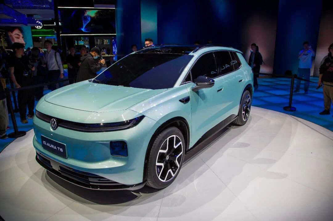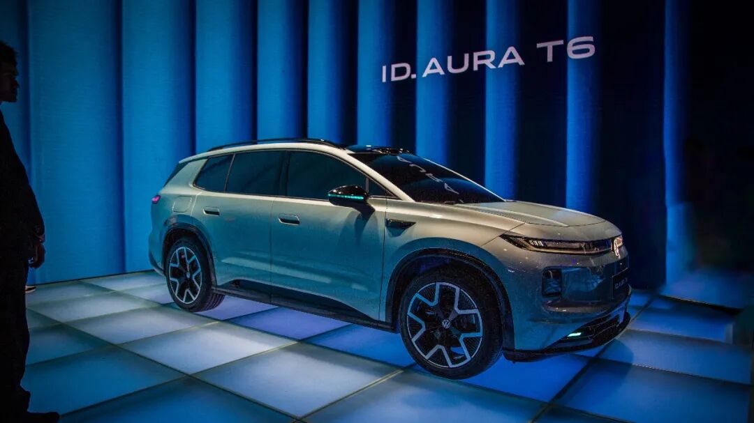 在A1馆内,大众汽车品牌的大展台内,一汽-大众、上汽大众、大众安徽三家合资伙伴的分展台有序排开,一台台新品展车有序地陈列其中,吸引着越来越多的人流驻足观赏。不过,最重磅的新品无疑是展台里侧舞台上的展车。还记得前面提到的大众品牌之夜一汽-大众为大家带来了什么吗?——ID. AURA序列的首款车型ID. AURA T6,只不过彼时展车依然身披全副伪装且无法看到真正的外观。而在本次车展中,ID. AURA T6正式无伪亮相并完成了全球首发仪式。这款车定位为一款纯电中型SUV,它采用的“自然实用主义”设计理念注重效能和美学的和谐共生,将自然质感与理性设计融于一体。通过挺拔的姿态、出色的车身比例、自信的轮廓、简洁的线条以及富有科技感的灯光造型,全方位演绎出不繁饰的原则。