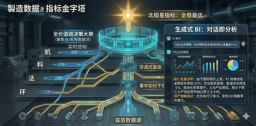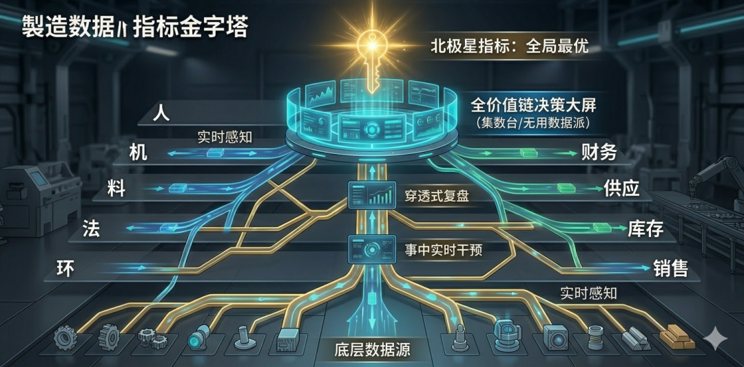 【技术侧】 跨系统(ERP/MES/SRM/PLM 等)关联极其复杂,如何重构断裂的“漏斗溯源模型”与“金字塔价值模型”。 - 【业务侧】 打破深根固柢的“部门墙”,构建全公司上下共识、跨部门对齐的“北极星指标”。
