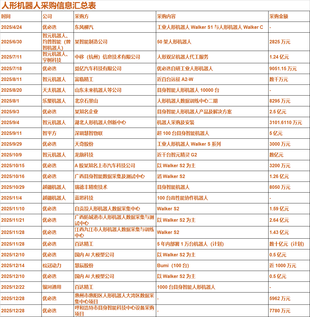 🔻智元机器人:据公司官网消息,2025 年 1 月,智元机器人第 1000 台通用具身机器人正式量产下线,刷新行业记录。同年 12 月,智元实现人形机器人 5100+台出货。
