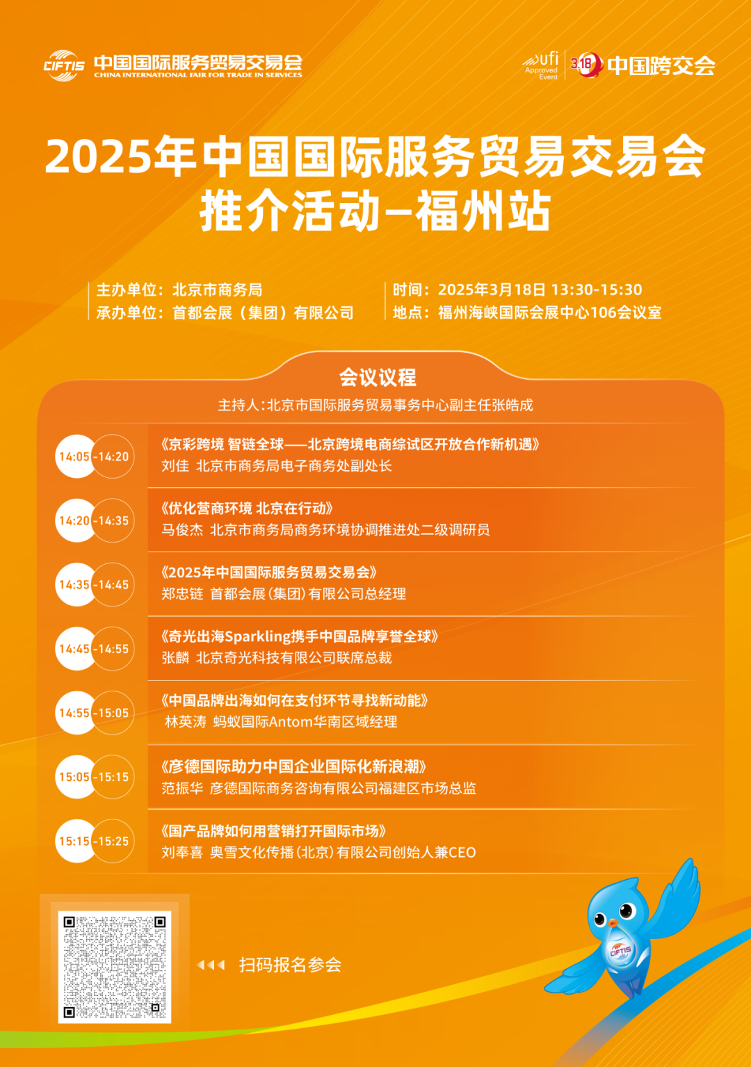 2025年3月18日14:00-15:30,在福州海峡国际会展中心106会议室,2025年中国国际服务贸易交易会(以下简称“服贸会”)推介活动——福州站将隆重举行!