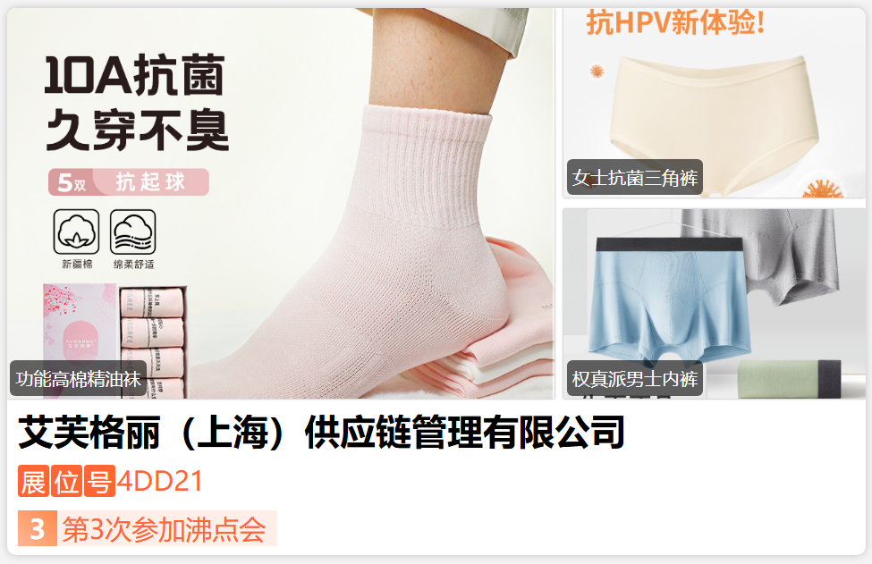 目前袜尖尖主营品牌有袜尖尖小黑袜、严白小白 t,良尖防滑拖鞋,可肉睡衣暖衣套装,以 “款少,量大,极 致性价比” 为特 色,产品注重品质和性价比,例如袜尖尖小黑袜,只做国标 a 类袜子,采用精梳长绒棉,含棉量高达 93%,具有吸汗、透气、10a 级抗菌等优点,且男女老少都有,每一组袜子都是独立密封包装 。-展位号:4DX06-