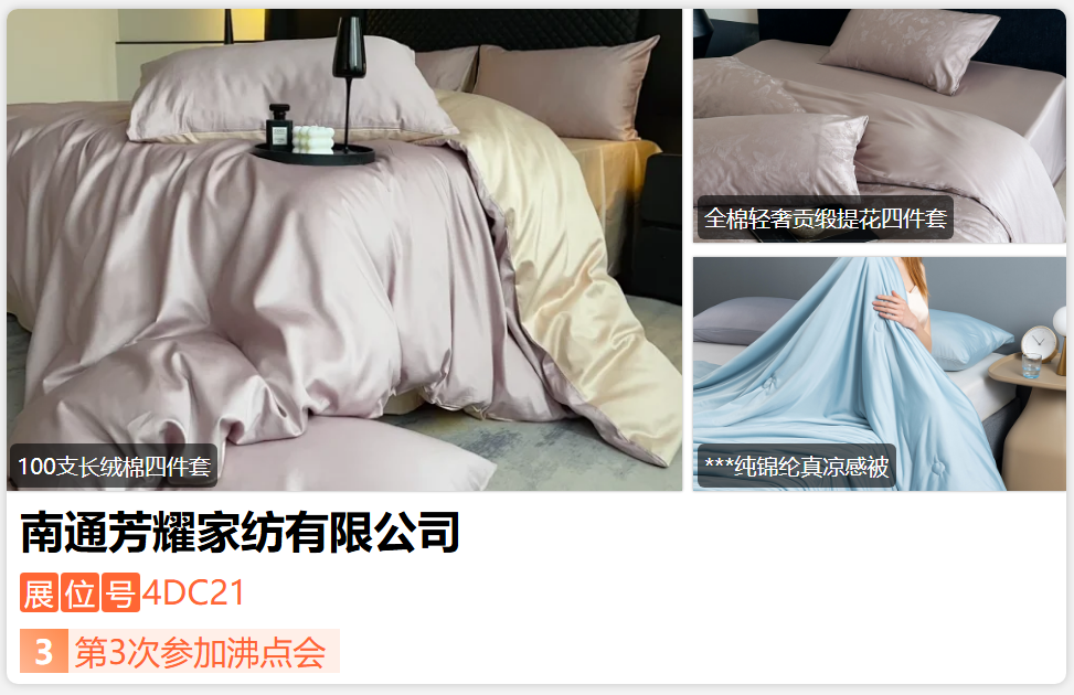 芳耀家纺是一家拥有12年深厚行业积淀的家纺企业,总部位于江苏省南通市叠石桥,以独立研发能力为核心驱动力,专注于高品质家纺产品的设计与生产。凭借长达十二年的微商一件代发运营经验,芳耀家纺构建了成熟、的供应链与服务体系,能够为合作伙伴提供从产品研发、生产到仓储、物流及售后支持的全链路解决方案。-展位号:4DL03-