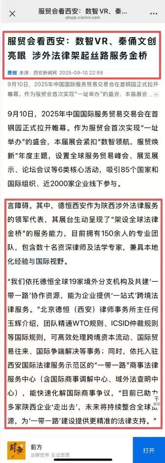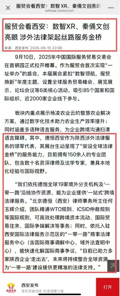 “我们依托德恒全球19家境外分支机构及‘一带一路’沿线协作资源,能为企业提供‘一站式’跨境法律服务。”北京德恒(西安)律师事务所主任何玉辉介绍,团队精通WTO规则、ICSID仲裁规则等国际规则,可高效处理跨境资本流动、国际贸易往来、国际争端解决等事务;同时,依托入驻西安国际法律服务示范区的“一带一路”商事法律服务中心(含国际商事调解中心、域外法查明中心),能快速化解国际商事争议,“目前已助力多家陕西企业‘走出去’,未来将持续整合全球资源,为‘一带一路’建设提供更精准的法律支持。”
