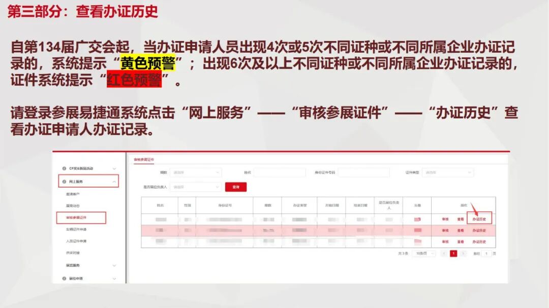 (五)本届广交会将对第134届广交会以来出现4次及以上跨证种、跨企业办证的人员予以重点关注,在办证系统中为各证件审核单位提供办证申请人员异常预警提示,授权查询审核范围内人员历史办证记录,各单位务必对预警人员从严审批。