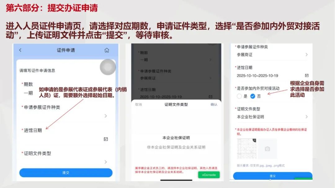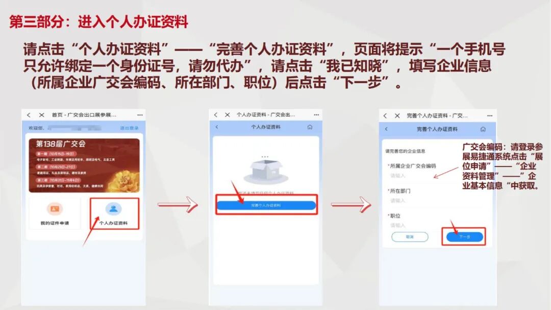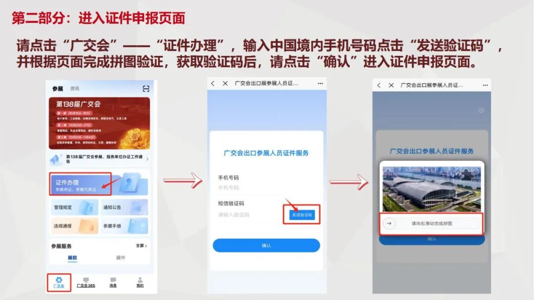 申请人员通过“广交会供应商APP”(首次注册须完成人脸活体检测)自行提交证件申请,填写提交包括个人姓名(含拼音)、工作岗位、手机号、身份证正反面照片、个人免冠照等资料。