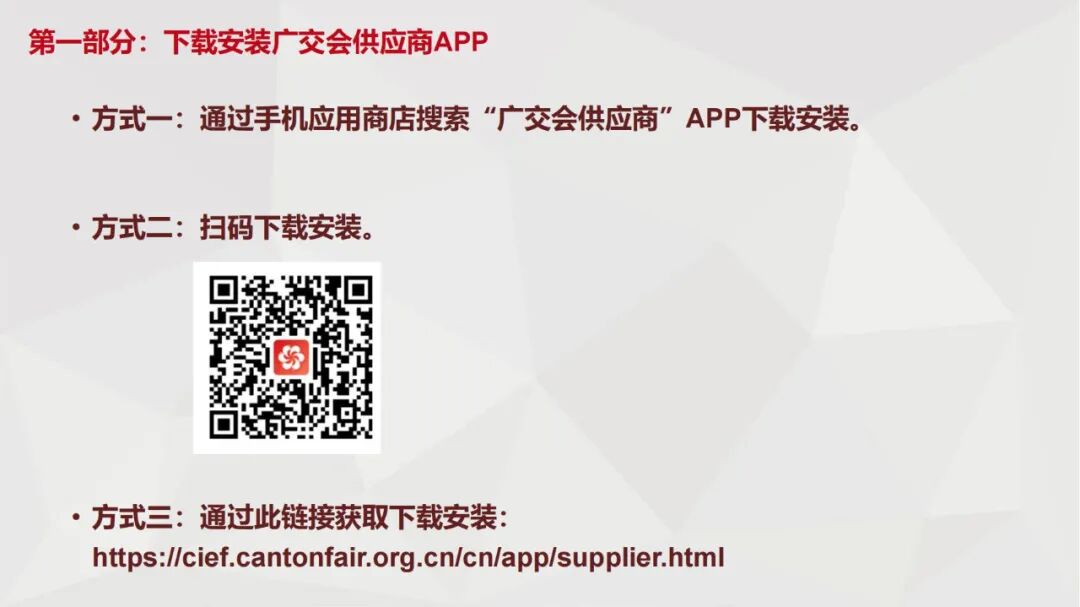 (六)出口展参展人员申办参展商证或参展代表证,均需下载使用“广交会供应商APP”提交本人申请,不能代为提交。