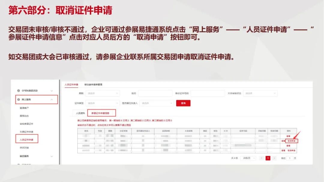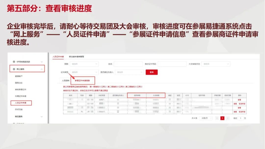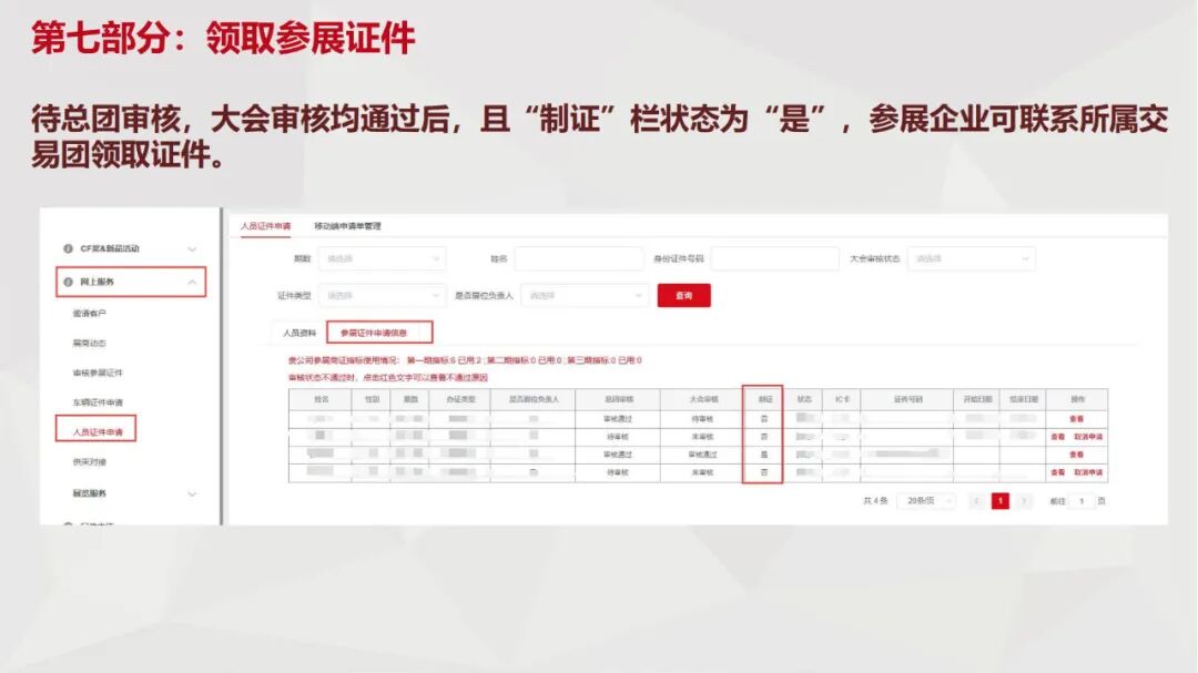 (4)如参展企业同一展期的所有展位负责人的参展商证资料未经证件服务中心审核通过,则当期该企业所有参展商证和参展代表证件将无法制证。