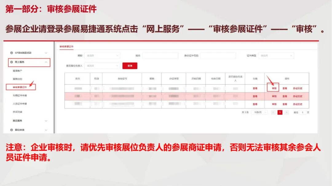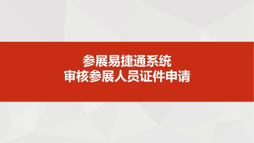 2.出口展同一展期内,任一展位负责人的证件申请未经证件中心审核通过前,该企业当期所有参展商证和参展代表证件均无法打印。