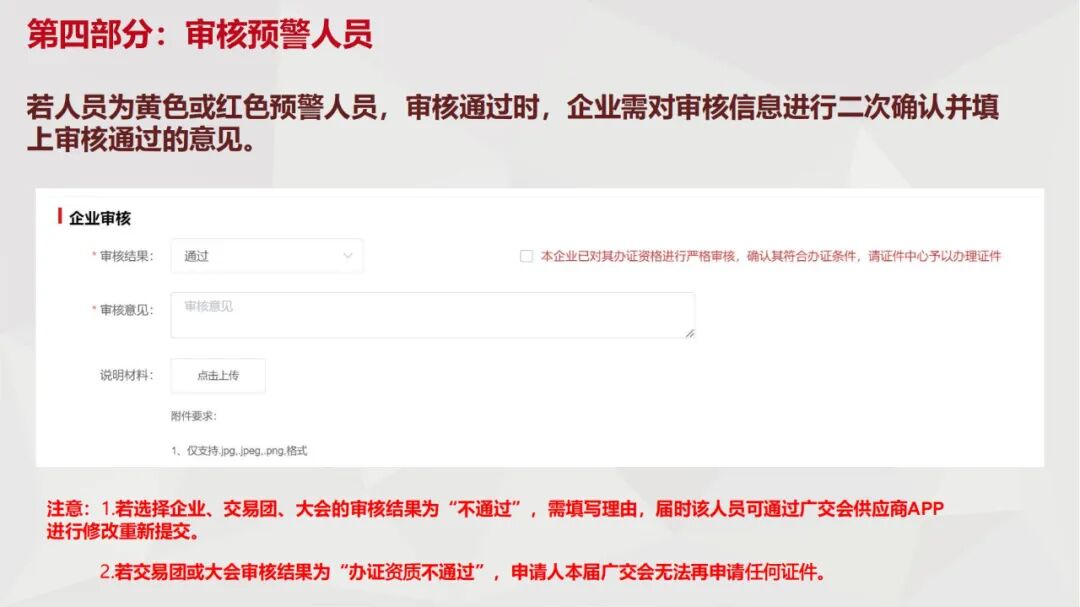 当办证申请人员出现4次或5次不同证种或不同所属企业办证记录的,系统提示“黄色预警”;出现6次及以上不同证种或不同所属企业办证记录的,证件系统提示“红色预警”。交易团、参展企业须对预警对象从严审批,非必要不予审核通过,办证审核当中不负责任的将予以严肃处理。