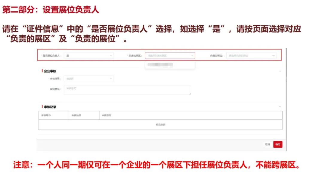 (2)参展企业必须完成同一展期所有参展展区的展位负责人确认后,方可提交该展期其他人员证件申请。
