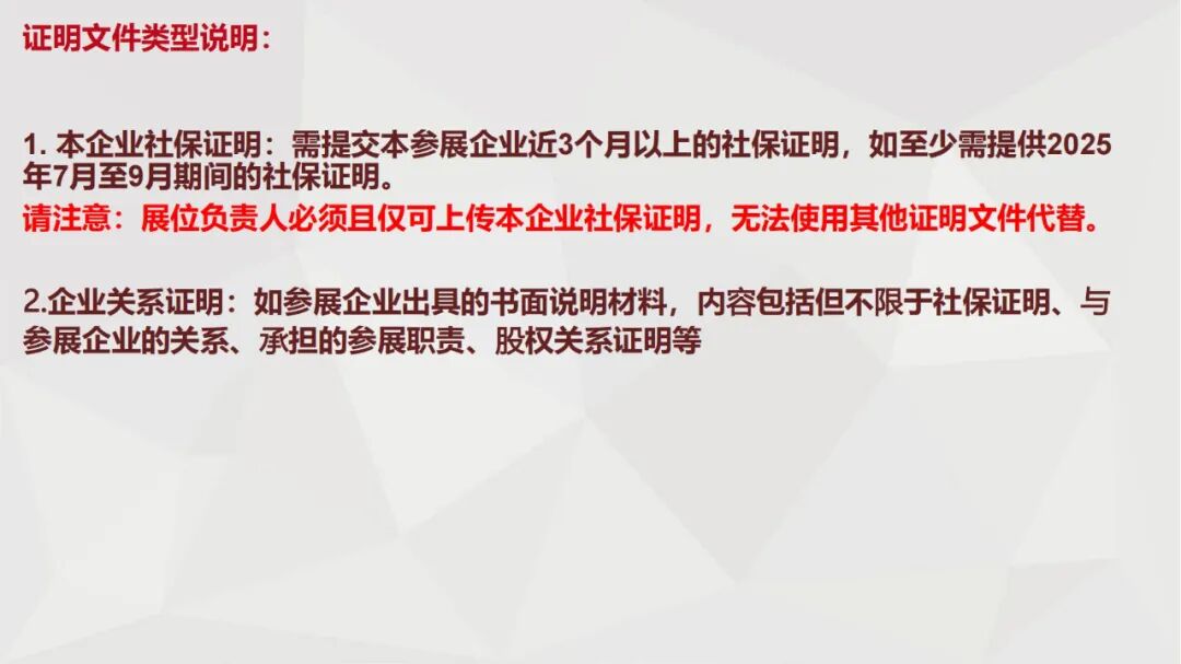 (四)其他出口展参展人员办理参展商证和参展代表证时,需提交的证明材料可以是在参展企业缴纳社保的证明,也可以是参展企业出具的书面盖章材料(内容包括其与参展企业的雇佣或业务关系、承担的参展职责、股权关系证明等)。