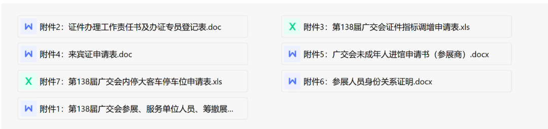 包括《第138届广交会参展、服务单位人员、筹撤展车辆证件办理的有关说明》《办证工作责任书及办证专员登记表》《第138届广交会证件指标调增申请表》《来宾证申请表》《广交会未成年人进馆申请书(参展商)》《参展人员身份关系证明》《第138届广交会内停大客车停车位申请表》,以上文件不再另行印发纸质版,请各单位自行从广交会官网下载、查阅和使用。