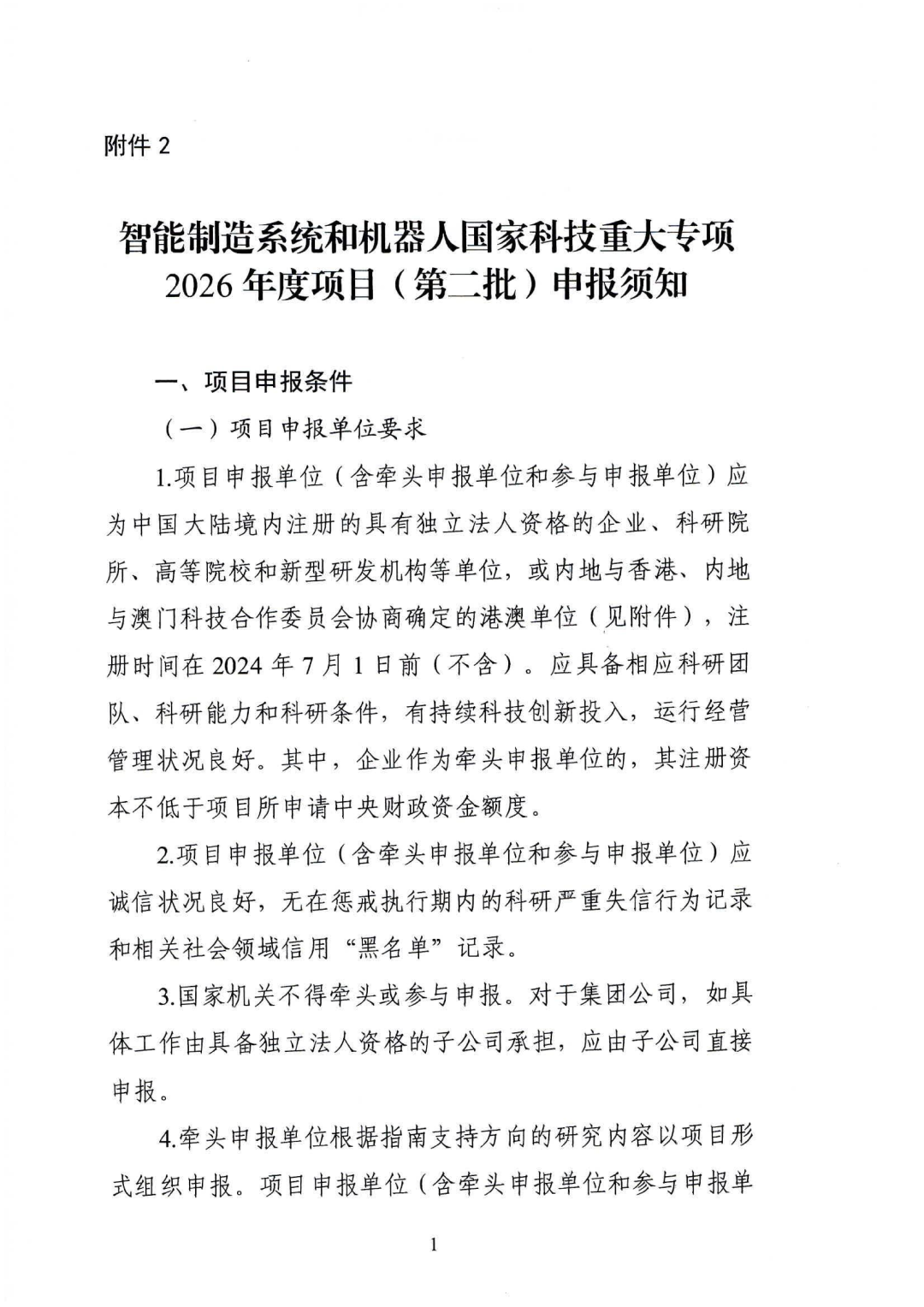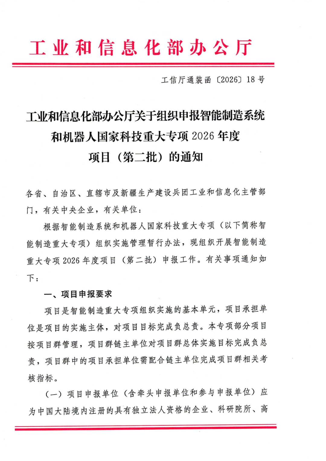 现将《关于组织申报智能制造系统和机器人国家科技重大专项2026年度项目(第二批)的通知》(工信厅通装函〔2026〕18号)转发给你们。请各盟市工信局认真研究,按照文件要求,组织本地区符合条件的企业积极申报,于2026年3月2日前完成国家科技管理信息系统公共服务平台线上申报。请推荐单位于3月3日前将加盖公章的推荐函报送至自治区工信厅装备工业处。