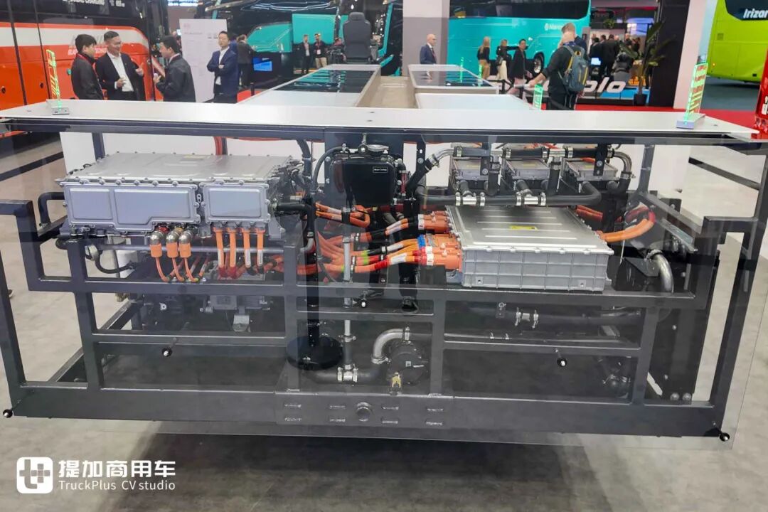 对于电动巴士而言,热管理是极为重要的。它既能保障三电系统处于最高工作效率,也能为车内带来舒适环境,减少能量耗散,这对续航里程和用车体验都有着关键的意义。在现场展出的底盘上,比亚迪为其搭载了集成式热管理系统。它集成了电池、电机、热泵空调的热交换系统,既能够回收车辆废热,还能与外部环境进行热交换,可将车辆的总能量消耗降低10%至50%,显著提升续航里程及使用经济性。同时,车辆还可选装二氧化碳空调,带来更为卓越的性能及效率。