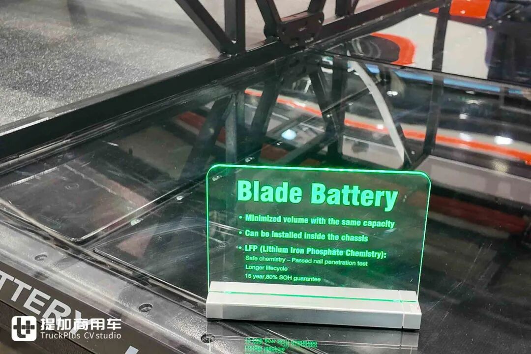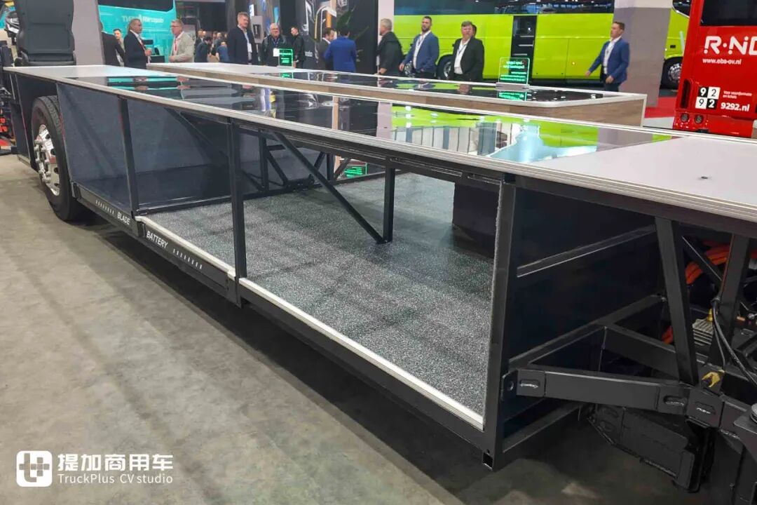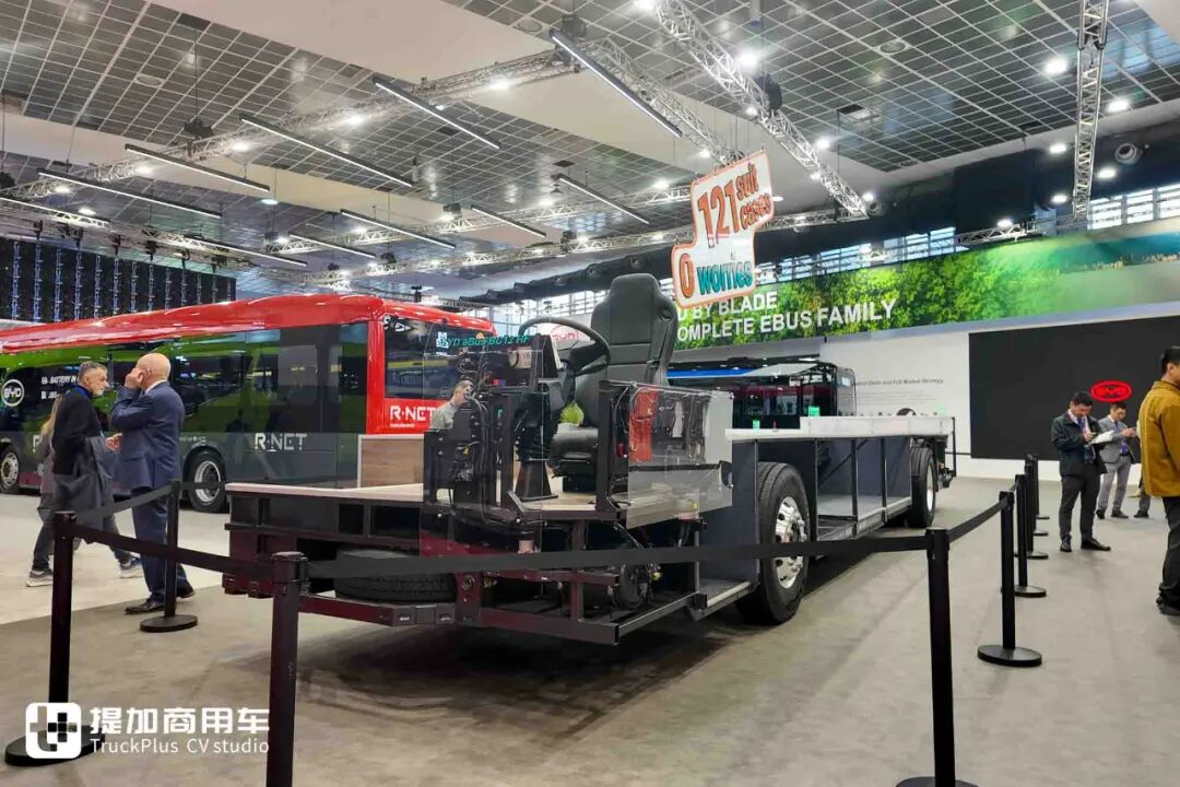 得益于全球首创的客车CTC技术,结合客车专用超薄刀片电池系统,比亚迪e-BUS平台3.0产品能够做到极高的车身空间利用率。在现场这台高地板纯电动巴士底盘上,车辆的行李舱容积能够与传统柴油车辆相同,不受电池组的挤占,可放下121个20寸行李箱。比亚迪为它设计了一个广告语:121 suit cases,0 worries,翻译过来就是:121个行李箱、0个担心,简单明了的点出了行业痛点和比亚迪的独特解决方案。