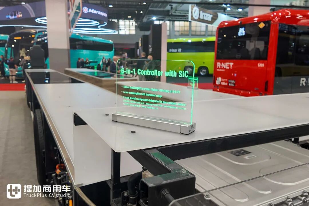 现场展出底盘采用了比亚迪自主研发的六合一控制器,以SiC碳化硅元件为核心。它提供了99.5%的极高效率,做到了最高水准。控制器内集成了两套电机控制单元、一套转向控制单元、一套空压机控制单元,附加DC-DC及电源分配系统。更高的集成度有助于提升效率,且能够减少电气连接点数量,这对实现更低故障率有着正面帮助。
