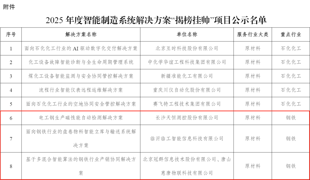 根据《关于开展2025年度智能制造系统解决方案“揭榜挂帅”项目申报和已揭榜项目验收工作的通知》(工信厅联通装函〔2025〕411号),现将拟入选的2025年度智能制造系统解决方案“揭榜挂帅”项目名单进行公示,请社会各界监督。如有异议,请在公示期内将书面意见反馈至工业和信息化部装备工业一司(智能制造处)。